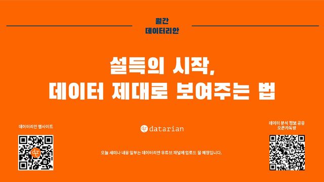 [월간 데이터리안 세미나 5월] 설득의 시작, 데이터 제대로 보여주는 법 강연 자료입니다. 지난 세미나는 인프런에서 다시 보실 수 있고, 슬라이드에 나와있는 데이터리안 오픈카톡방에서 다음 세미나 소식을 빠르게 받아보실 수 있습니다. --- 다음 달 라이브 세미나 안내: https://www.datarian.io/webinar 세미나 다시보기: https://www.inflearn.com/roadmaps/564