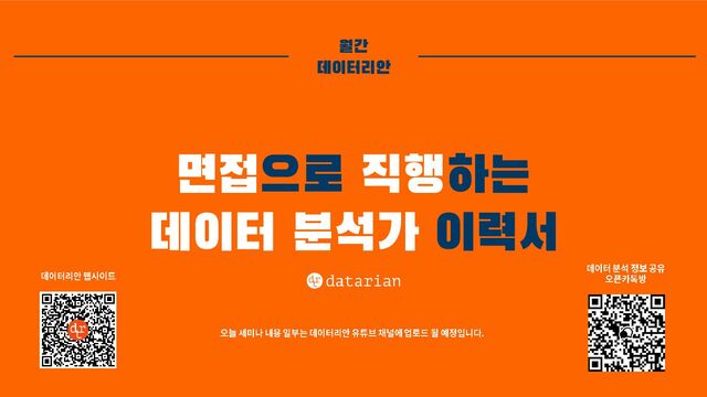 [월간 데이터리안 세미나 2월] 면접으로 직행하는 데이터 분석가 강연 자료입니다. 지난 세미나는 인프런에서 다시 보실 수 있고, 슬라이드에 나와있는 데이터리안 오픈카톡방에서 이후 세미나 소식을 빠르게 받아보실 수 있습니다. --- 다음 달 라이브 세미나 안내: https://www.datarian.io/webinar 2월 세미나 다시보기(인프런): https://www.inflearn.com/roadmaps/564