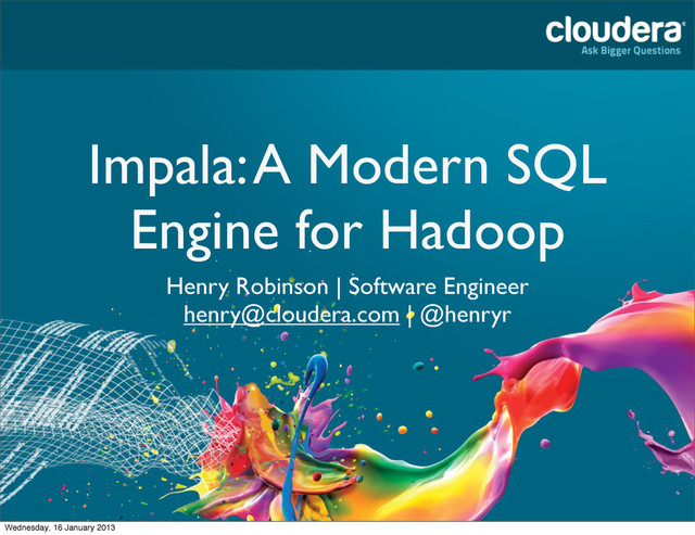 from the development process: • Impala can get full disk throughput, I/O- bound workloads faster by 3-4x. • Multiple phase Hive queries see larger speedup in Impala • Queries against in-memory data can be up to 100x faster 30 Wednesday, 16 January 2013