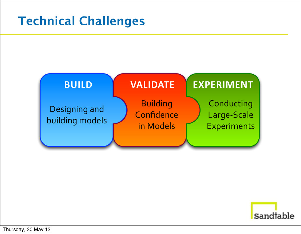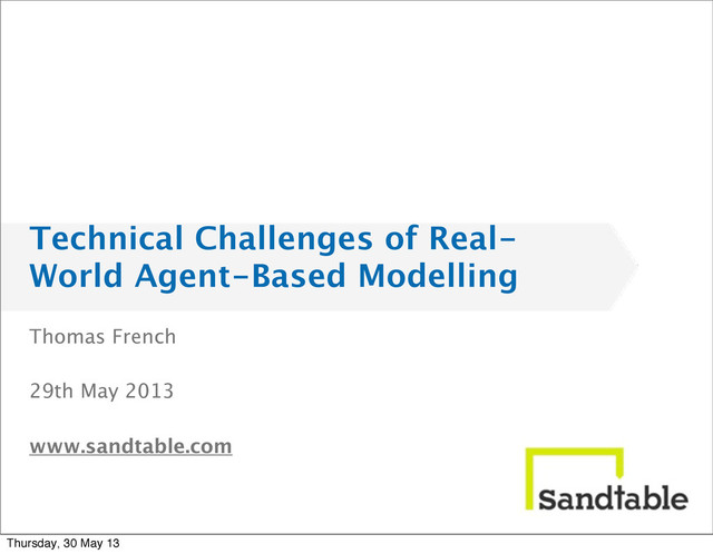 for understanding complex systems: – heterogeneous and adaptive actors – complex interactions: interdependencies; feedback loops – dynamic environment • It provides an accessible metaphor for modelling – modelling individuals • More and more data is available for our models - Finer levels of granularity • Computing power is available on-demand - Costs continue to reduce Thursday, 30 May 13