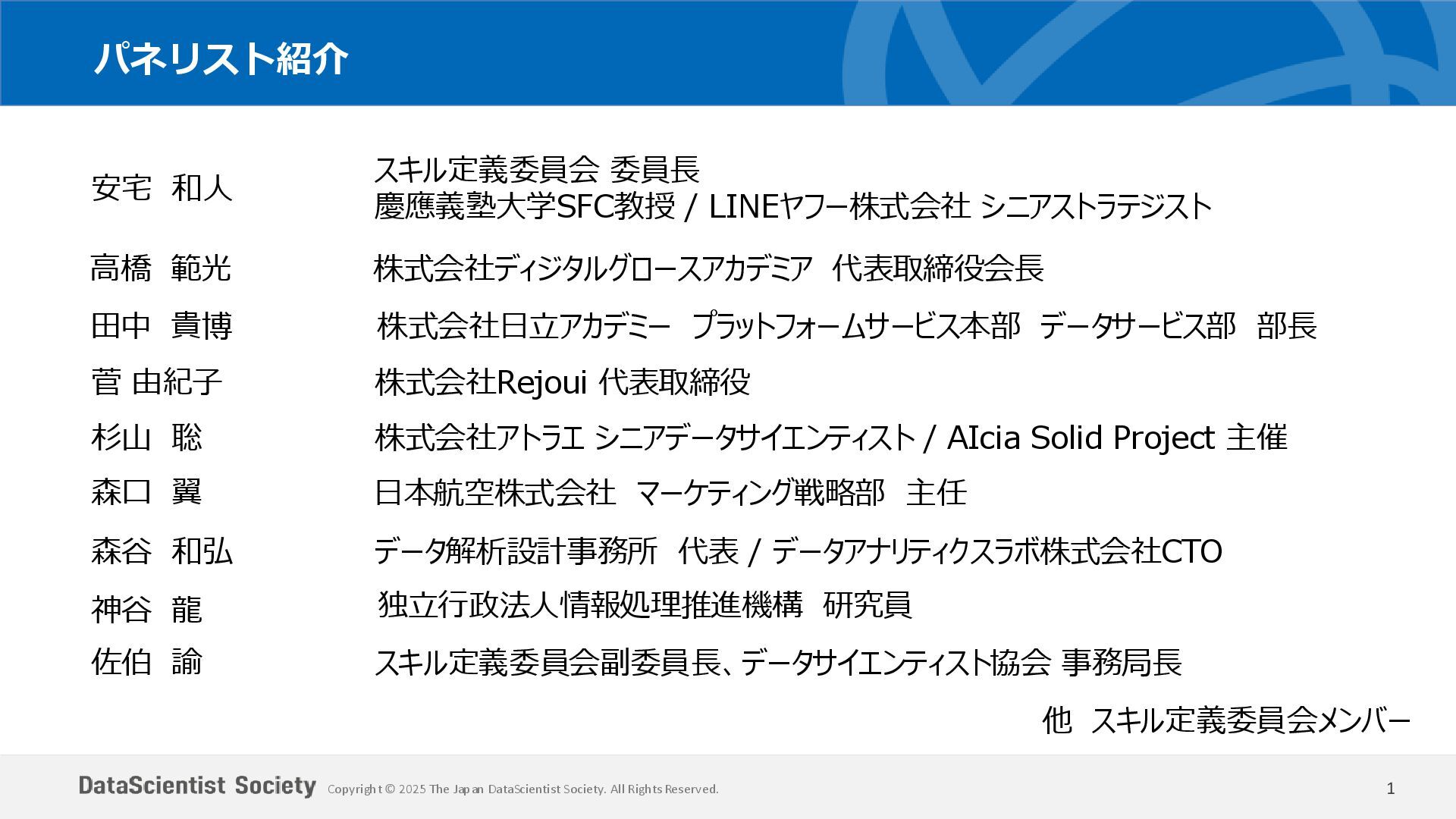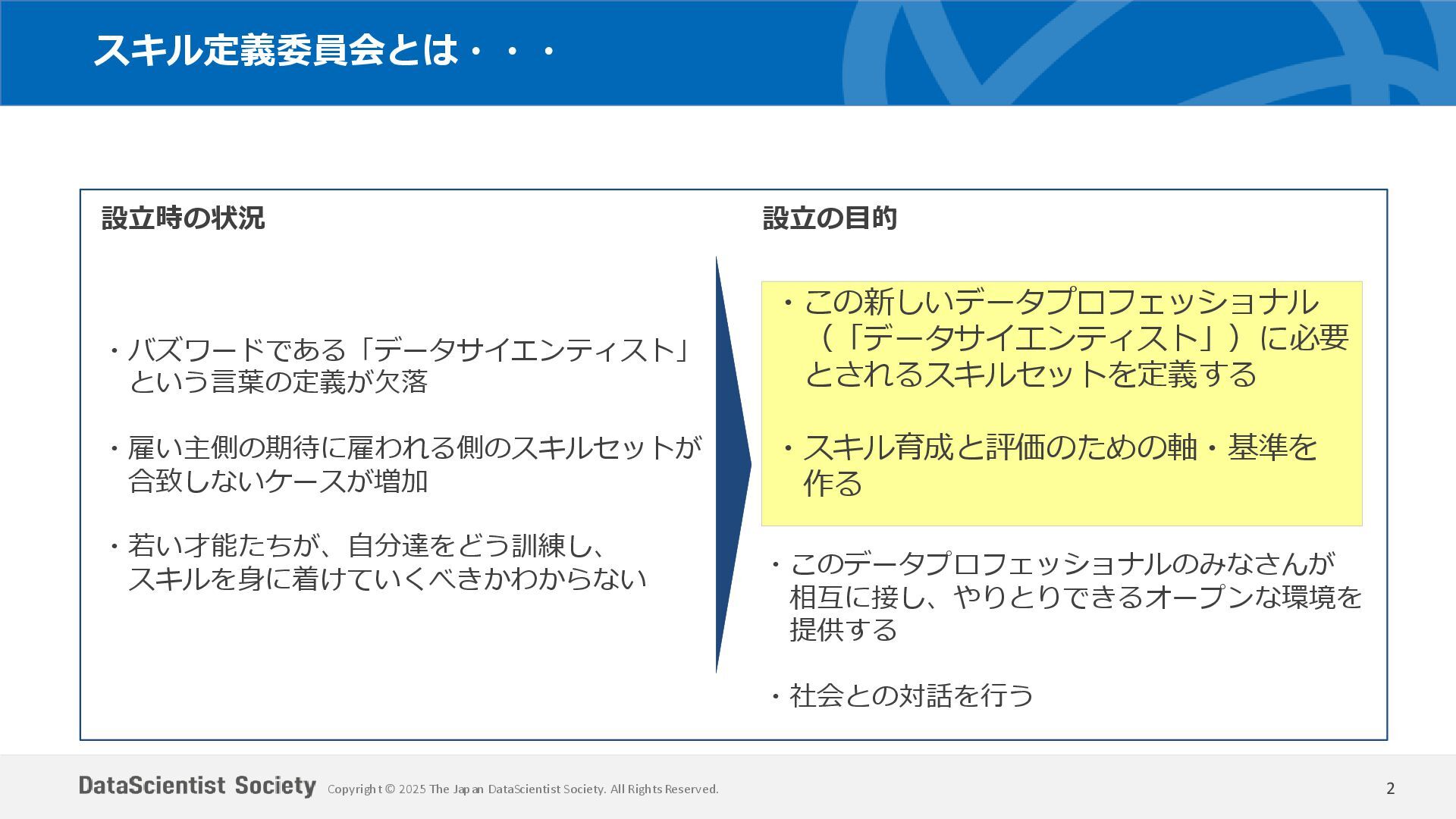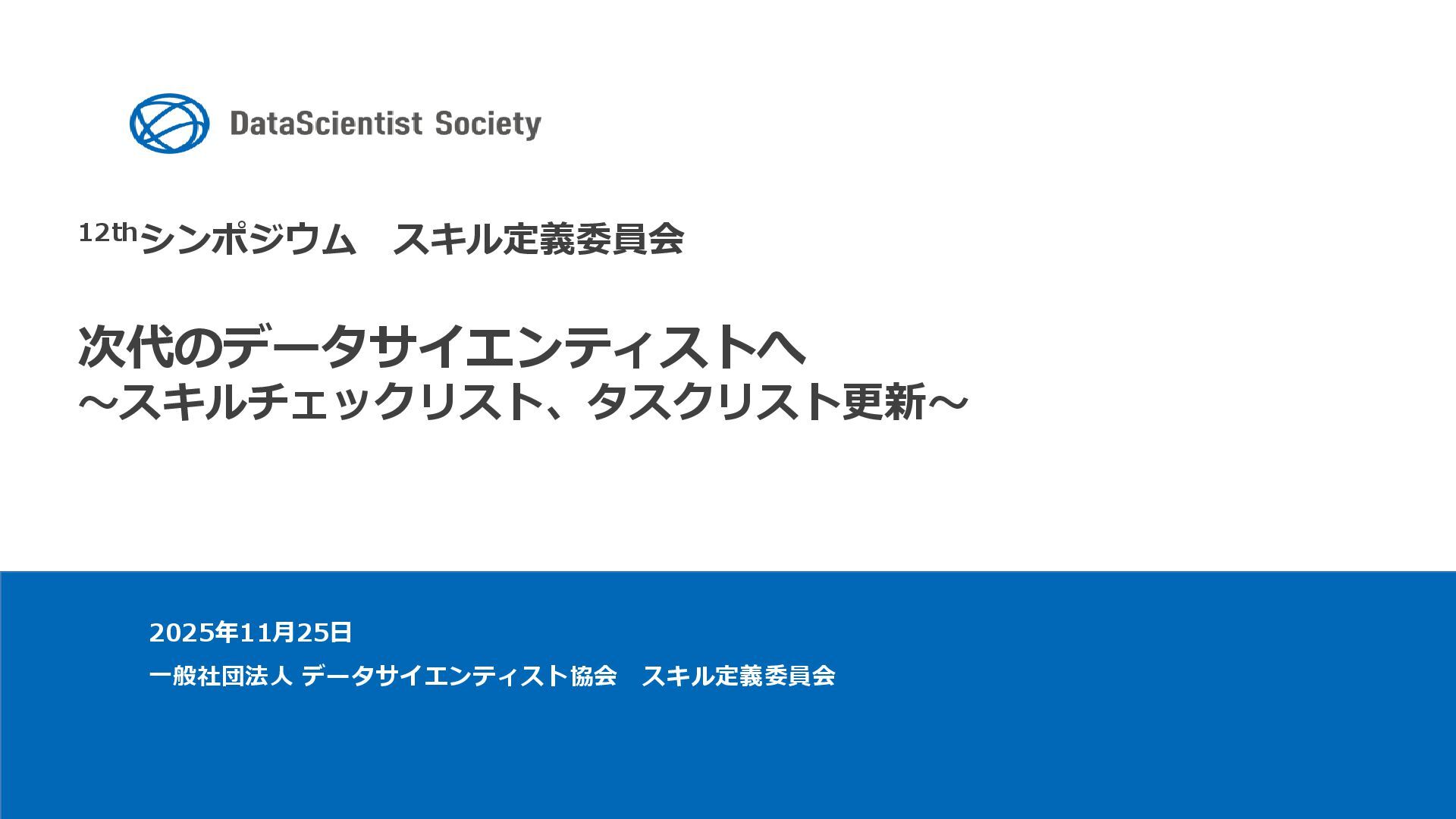 12thシンポジウム スキル定義委員会 次代のデータサイエンティストへ ~スキルチェックリスト、タスクリスト更新~ 2025年11月25日 一般社団法人 データサイエンティスト協会 スキル定義委員会