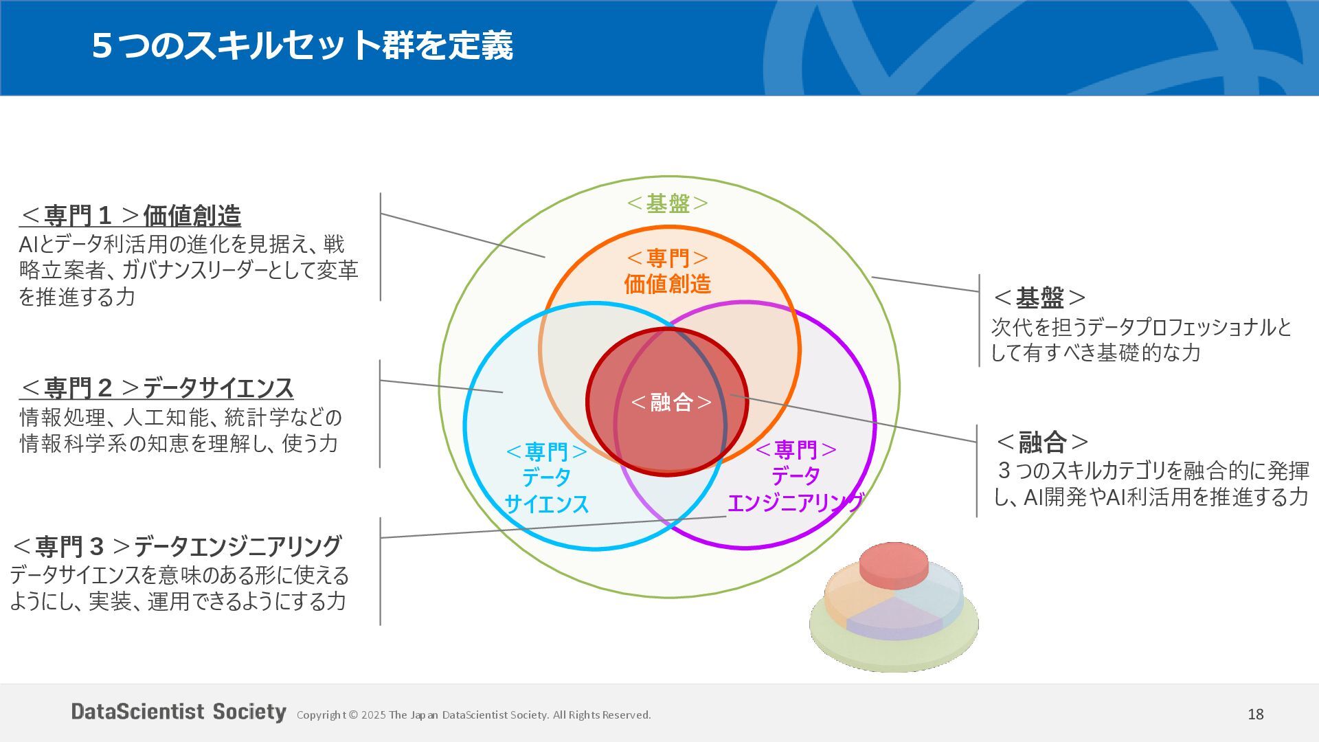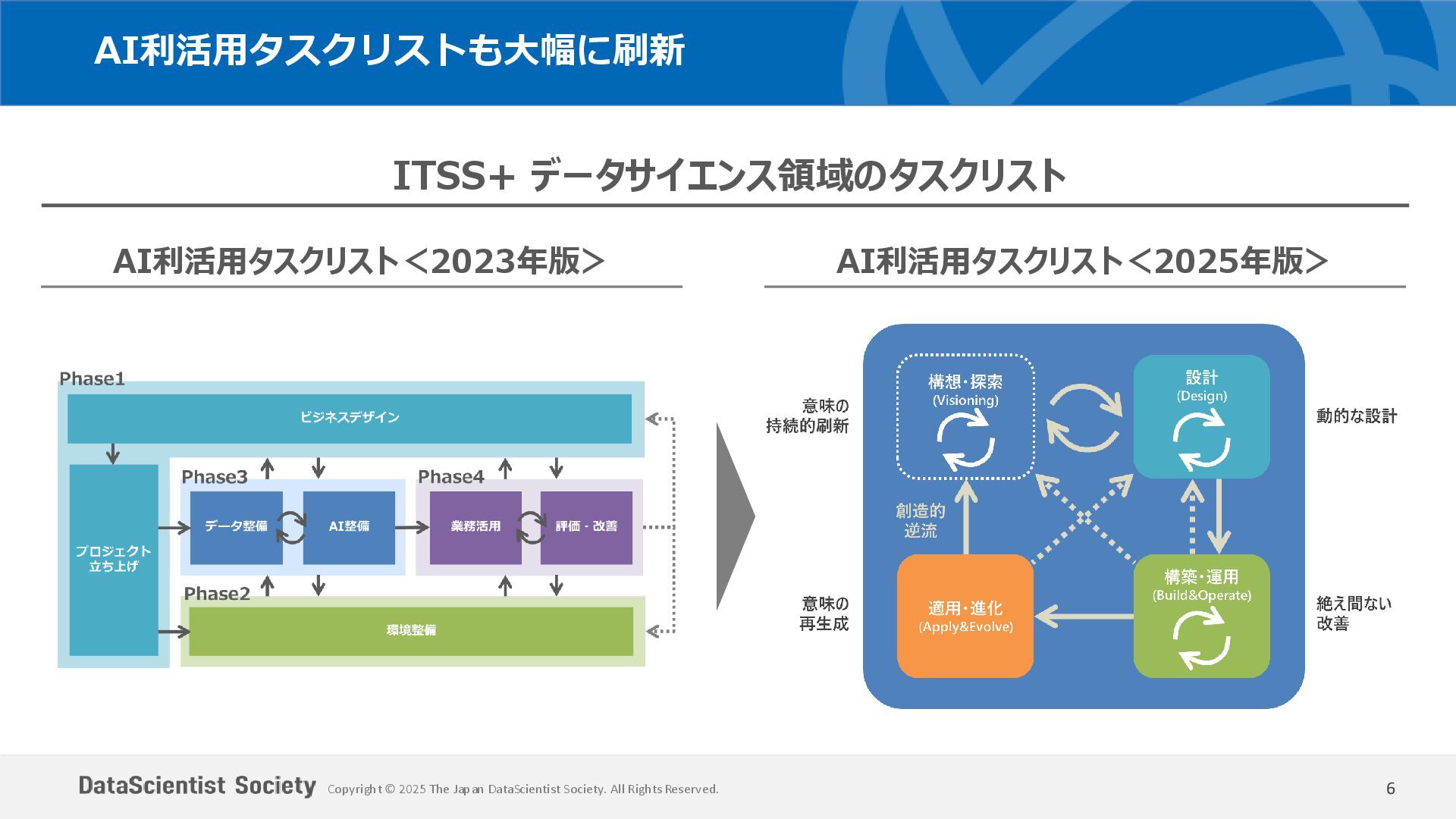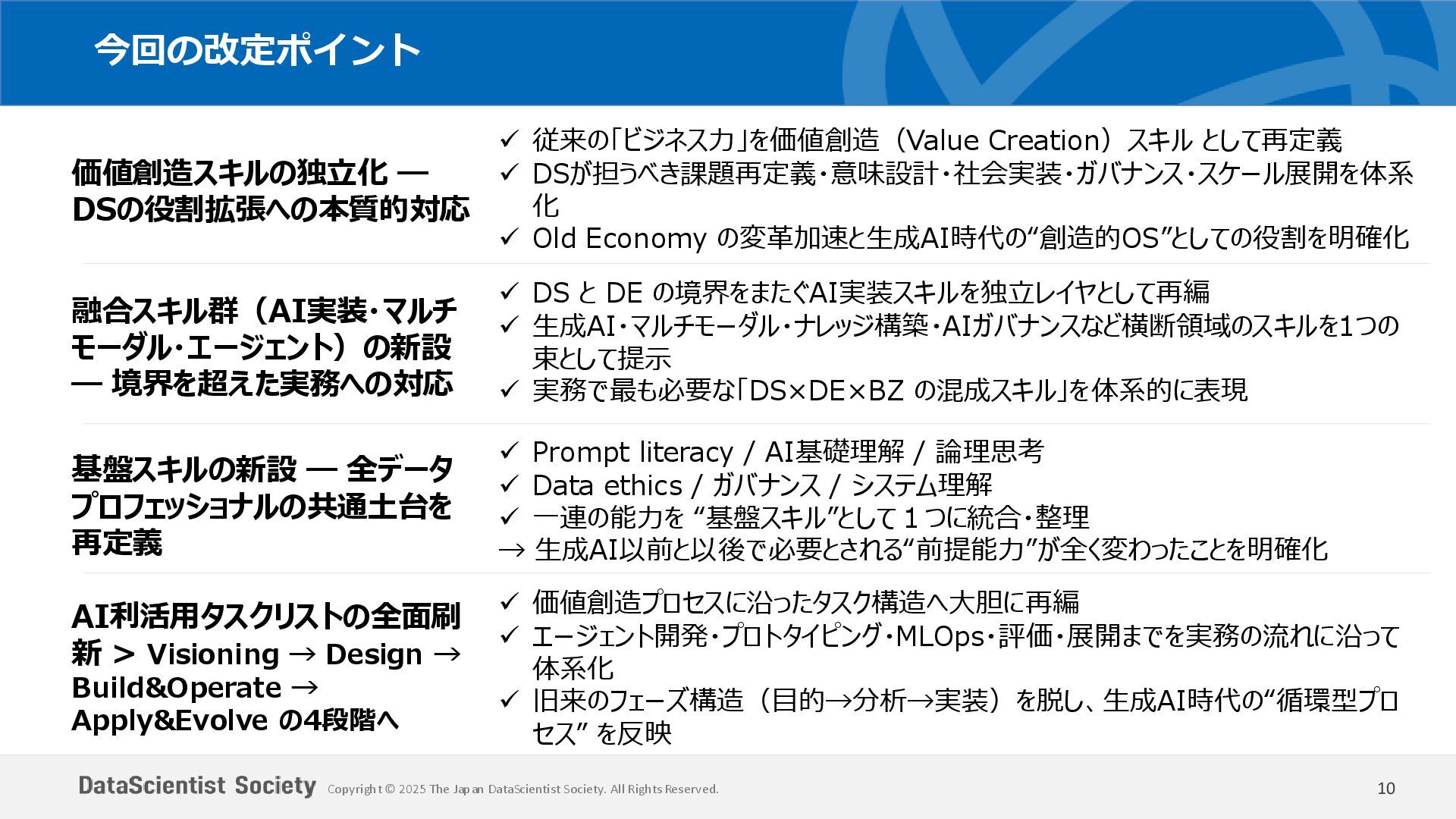 今回の改定ポイント 10 価値創造スキルの独立化 ― DSの役割拡張への本質的対応 ✓ 従来の「ビジネス力」を価値創造(Value Creation)スキル として再定義 ✓ DSが担うべき課題再定義・意味設計・社会実装・ガバナンス・スケール展開を体系 化 ✓ Old Economy の変革加速と生成AI時代の“創造的OS”としての役割を明確化 融合スキル群(AI実装・マルチ モーダル・エージェント)の新設 ― 境界を超えた実務への対応 ✓ DS と DE の境界をまたぐAI実装スキルを独立レイヤとして再編 ✓ 生成AI・マルチモーダル・ナレッジ構築・AIガバナンスなど横断領域のスキルを1つの 束として提示 ✓ 実務で最も必要な「DS×DE×BZ の混成スキル」を体系的に表現 基盤スキルの新設 ― 全データ プロフェッショナルの共通土台を 再定義 ✓ Prompt literacy / AI基礎理解 / 論理思考 ✓ Data ethics / ガバナンス / システム理解 ✓ 一連の能力を “基盤スキル”として1つに統合・整理 → 生成AI以前と以後で必要とされる“前提能力”が全く変わったことを明確化 AI利活用タスクリストの全面刷 新 > Visioning → Design → Build&Operate → Apply&Evolve の4段階へ ✓ 価値創造プロセスに沿ったタスク構造へ大胆に再編 ✓ エージェント開発・プロトタイピング・MLOps・評価・展開までを実務の流れに沿って 体系化 ✓ 旧来のフェーズ構造(目的→分析→実装)を脱し、生成AI時代の“循環型プロ セス” を反映
