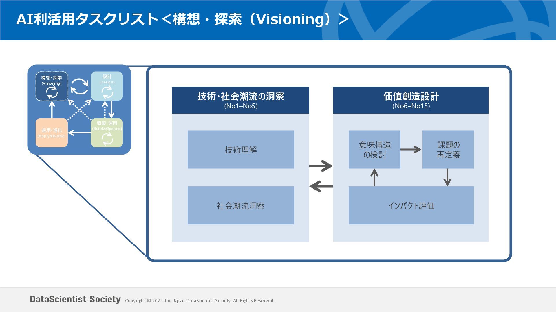 AI利活用タスクリスト<構想・探索(Visioning)> 設計 (Design) 構築・運用 (Build&Operate) 適用・進化 (Apply&Evolve) 構想・探索 (Visioning) 技術・社会潮流の洞察 (No1–No5) 価値創造設計 (No6–No15) 社会潮流洞察 技術理解 インパクト評価 意味構造 の検討 課題の 再定義