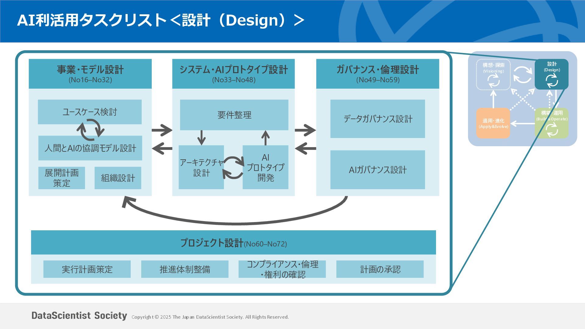 設計 (Design) 構築・運用 (Build&Operate) 適用・進化 (Apply&Evolve) 構想・探索 (Visioning) AI利活用タスクリスト<設計(Design)> プロジェクト設計(No60–No72) 実行計画策定 推進体制整備 コンプライアンス・倫理 ・権利の確認 計画の承認 事業・モデル設計 (No16–No32) 展開計画 策定 組織設計 ユースケース検討 人間とAIの協調モデル設計 ガバナンス・倫理設計 (No49–No59) AIガバナンス設計 データガバナンス設計 システム・AIプロトタイプ設計 (No33–No48) 要件整理 AI プロトタイプ 開発 アーキテクチャ 設計