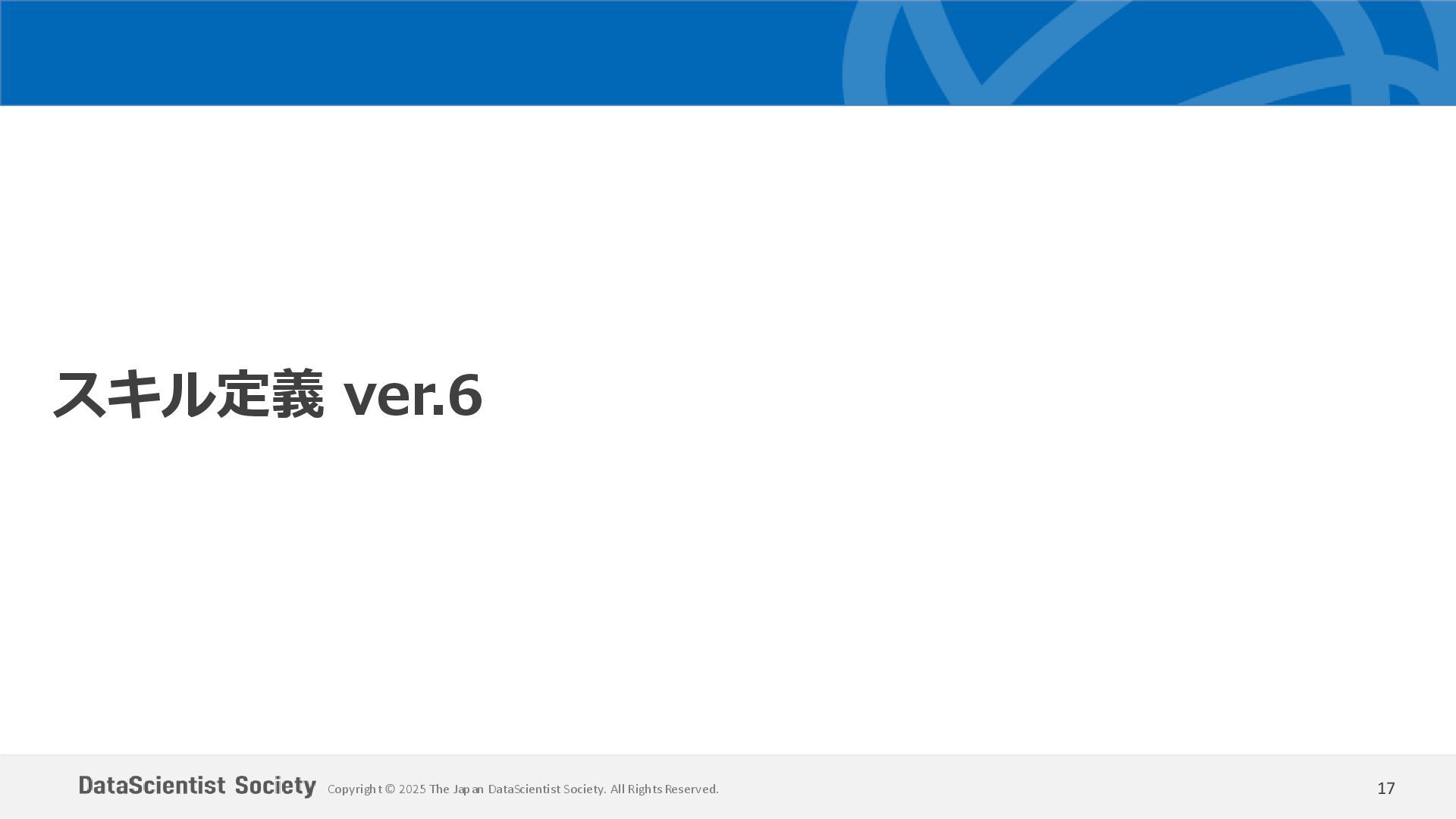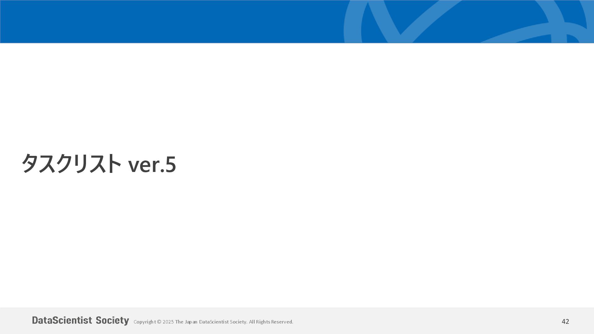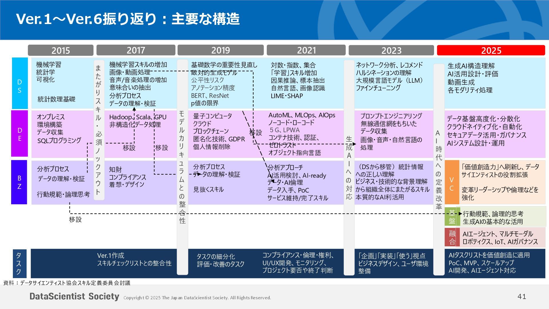 Ver.1~Ver.6振り返り:主要な構造 41 2015 2023 2017 2019 2021 量子コンピュータ クラウド ブロックチェーン 匿名化技術、GDPR 個人情報削除 コンプライアンス・倫理・権利、 UI/UX開発、モニタリング、 プロジェクト要否や終了判断 D S D E B Z 統計数理基礎 知財 コンプライアンス 着想・デザイン 行動規範・論理思考 SQLプログラミング 分析プロセス データの理解・検証 オンプレミス 環境構築 データ収集 基礎数学の重要性見直し 敵対的生成モデル 公平性リスク アノテーション精度 BERT、ResNet p値の限界 機械学習スキルの増加 画像・動画処理 音声/音楽処理の増加 意味合いの抽出 移設 Hadoop、Scala、GPU 非構造化データ処理 AutoML、MLOps、AIOps ノーコード・ローコード 5G、LPWA コンテナ技術、認証、 ゼロトラスト オブジェクト指向言語 分析アプローチ AI活用検討、AI-ready データ・AI倫理 データ入手、PoC サービス維持/完了スキル 対数・指数、集合 「学習」スキル増加 因果推論、標本抽出 自然言語、画像認識 LIME・SHAP 分析プロセス データの理解・検証 見抜くスキル 機械学習 統計学 可視化 移設 移設 タ ス ク Ver.1作成 スキルチェックリストとの整合性 タスクの細分化 評価・改善のタスク ま た が り ス キ ル ・ 必 須 ノ ッ ク ア ウ ト 分析プロセス データの理解・検証 モ デ ル カ リ キ ュ ラ ム と の 整 合 性 生 成 A I へ の 対 応 (DSから移管)統計情報 への正しい理解 ビジネス・技術的な背景理解 から組織全体にまたがるスキル 本質的なAI利活用 プロンプトエンジニアリング 無線通信網をもちいた データ収集 画像・音声・自然言語の 処理 「企画」「実装」「使う」視点 ビジネスデザイン、ユーザ環境 整備 2025 ネットワーク分析、レコメンド ハルシネーションの理解 大規模言語モデル(LLM) ファインチューニング 基 盤 融 合 行動規範、論理的思考 生成AIの基本的な活用 V C 生成AI構造理解 AI活用設計・評価 動画生成 各モダリティ処理 A I 時 代 へ の 定 義 改 革 データ基盤高度化・分散化 クラウドネイティブ化・自動化 セキュアデータ活用・ガバナンス AIシステム設計・運用 AIエージェント、マルチモーダル ロボティクス、IoT、AIガバナンス 「価値創造力」へ刷新し、データ サイエンティストの役割拡張 変革リーダーシップや倫理などを 強化 移設 AIタスクリストを価値創造に適用 PoC、MVP、スケールアップ AI開発、AIエージェント対応 資料:データサイエンティスト協会スキル定義委員会討議
