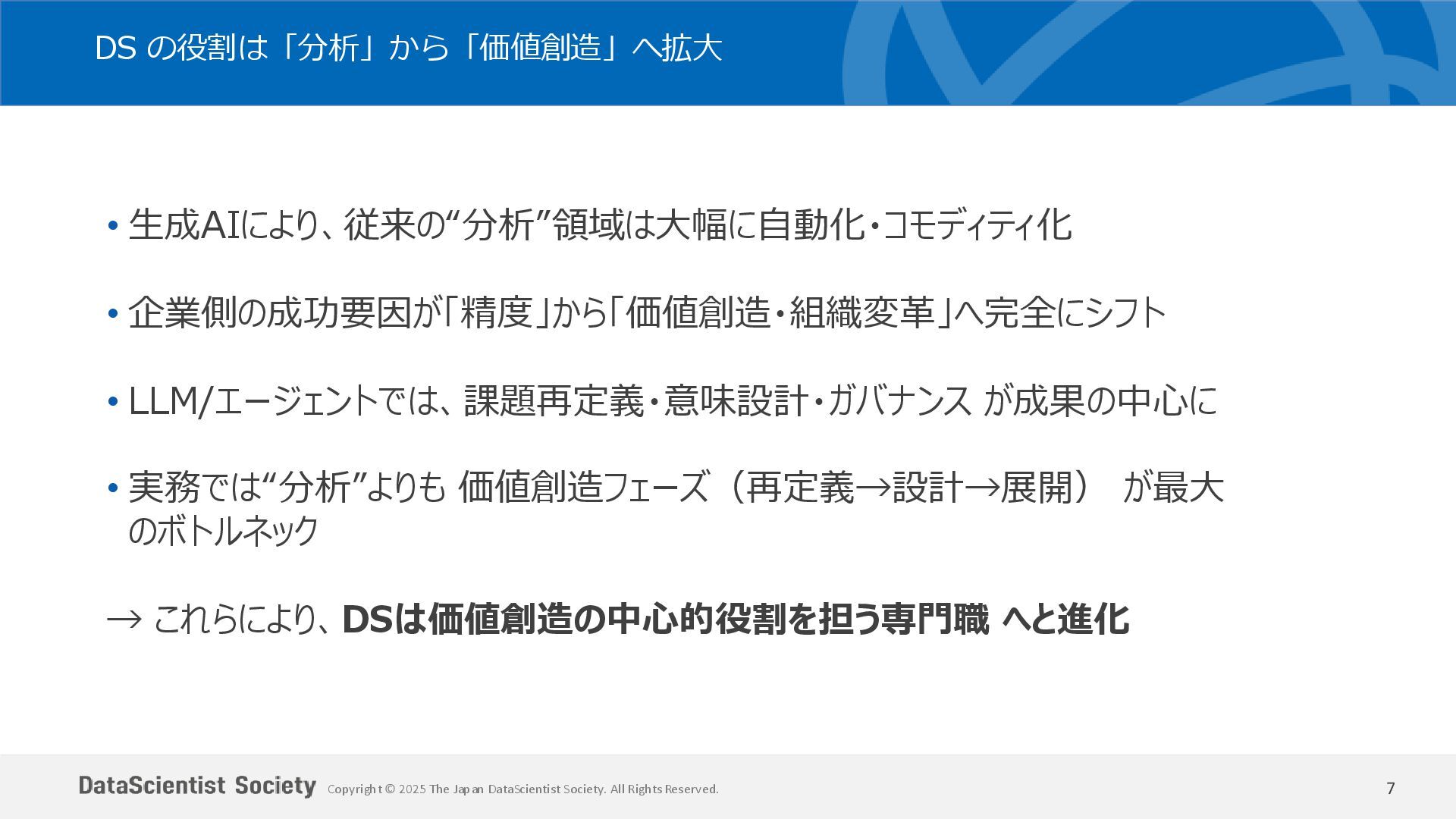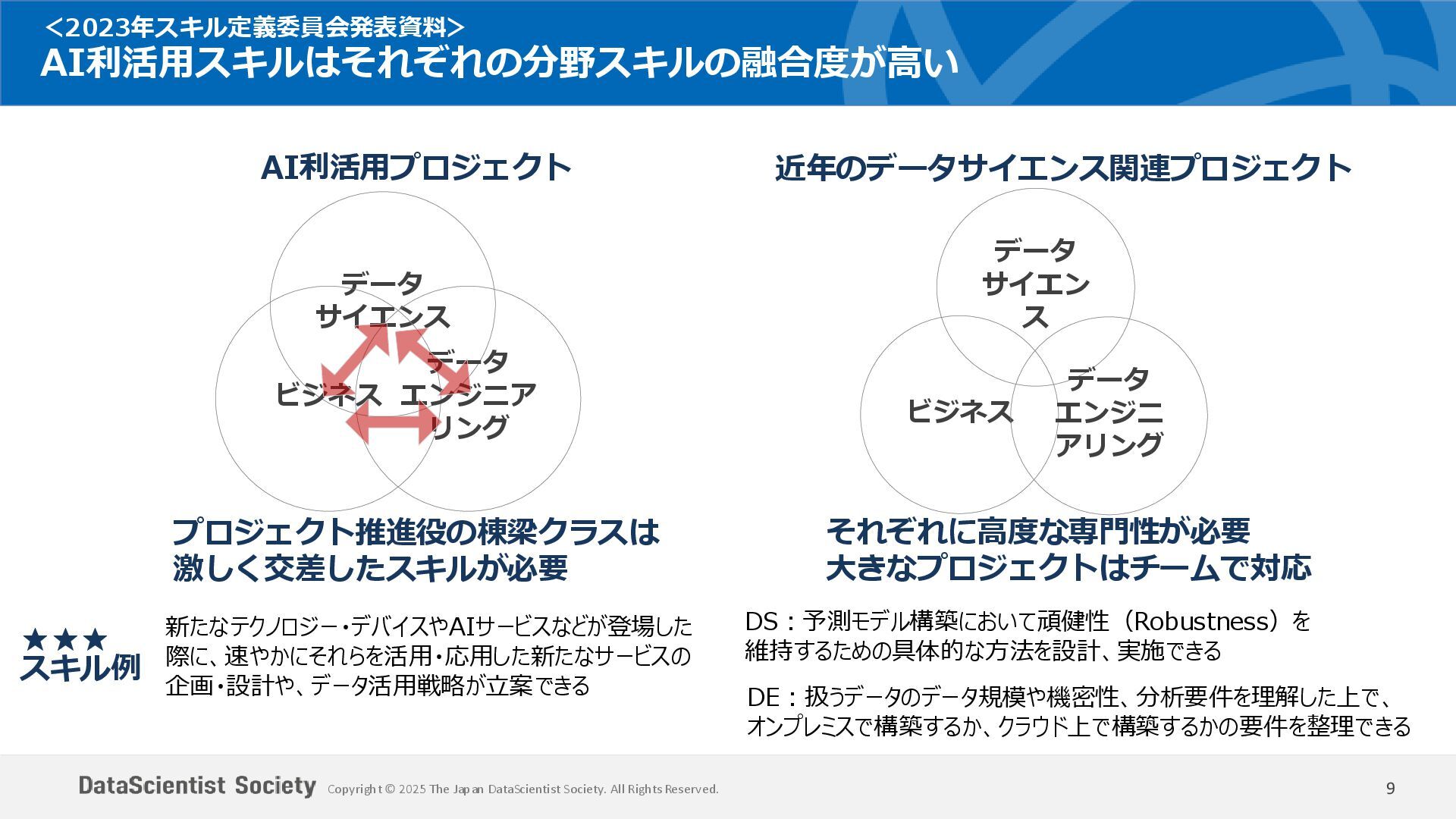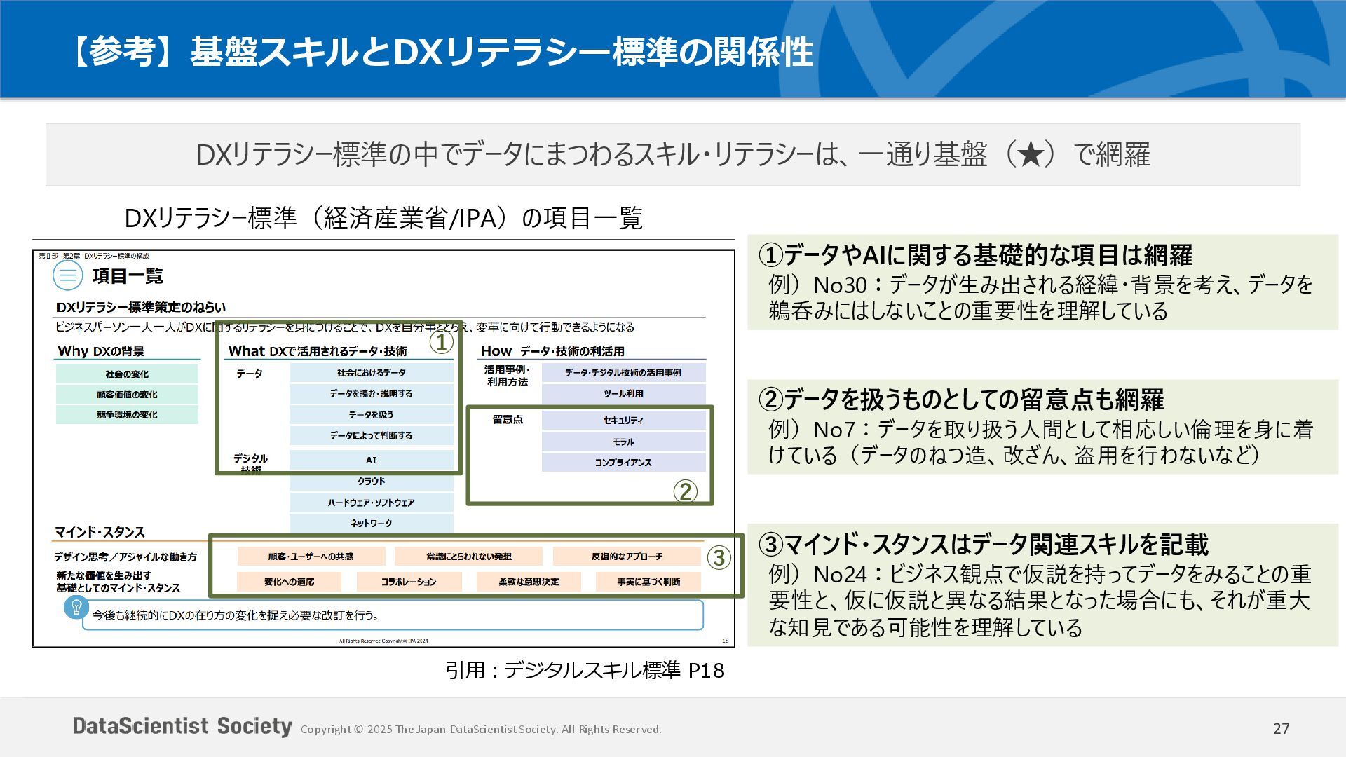Ver.1~Ver.6振り返り:主要な構造 41 2015 2023 2017 2019 2021 量子コンピュータ クラウド ブロックチェーン 匿名化技術、GDPR 個人情報削除 コンプライアンス・倫理・権利、 UI/UX開発、モニタリング、 プロジェクト要否や終了判断 D S D E B Z 統計数理基礎 知財 コンプライアンス 着想・デザイン 行動規範・論理思考 SQLプログラミング 分析プロセス データの理解・検証 オンプレミス 環境構築 データ収集 基礎数学の重要性見直し 敵対的生成モデル 公平性リスク アノテーション精度 BERT、ResNet p値の限界 機械学習スキルの増加 画像・動画処理 音声/音楽処理の増加 意味合いの抽出 移設 Hadoop、Scala、GPU 非構造化データ処理 AutoML、MLOps、AIOps ノーコード・ローコード 5G、LPWA コンテナ技術、認証、 ゼロトラスト オブジェクト指向言語 分析アプローチ AI活用検討、AI-ready データ・AI倫理 データ入手、PoC サービス維持/完了スキル 対数・指数、集合 「学習」スキル増加 因果推論、標本抽出 自然言語、画像認識 LIME・SHAP 分析プロセス データの理解・検証 見抜くスキル 機械学習 統計学 可視化 移設 移設 タ ス ク Ver.1作成 スキルチェックリストとの整合性 タスクの細分化 評価・改善のタスク ま た が り ス キ ル ・ 必 須 ノ ッ ク ア ウ ト 分析プロセス データの理解・検証 モ デ ル カ リ キ ュ ラ ム と の 整 合 性 生 成 A I へ の 対 応 (DSから移管)統計情報 への正しい理解 ビジネス・技術的な背景理解 から組織全体にまたがるスキル 本質的なAI利活用 プロンプトエンジニアリング 無線通信網をもちいた データ収集 画像・音声・自然言語の 処理 「企画」「実装」「使う」視点 ビジネスデザイン、ユーザ環境 整備 2025 ネットワーク分析、レコメンド ハルシネーションの理解 大規模言語モデル(LLM) ファインチューニング 基 盤 融 合 行動規範、論理的思考 生成AIの基本的な活用 V C 生成AI構造理解 AI活用設計・評価 動画生成 各モダリティ処理 A I 時 代 へ の 定 義 改 革 データ基盤高度化・分散化 クラウドネイティブ化・自動化 セキュアデータ活用・ガバナンス AIシステム設計・運用 AIエージェント、マルチモーダル ロボティクス、IoT、AIガバナンス 「価値創造力」へ刷新し、データ サイエンティストの役割拡張 変革リーダーシップや倫理などを 強化 移設 AIタスクリストを価値創造に適用 PoC、MVP、スケールアップ AI開発、AIエージェント対応 資料:データサイエンティスト協会スキル定義委員会討議