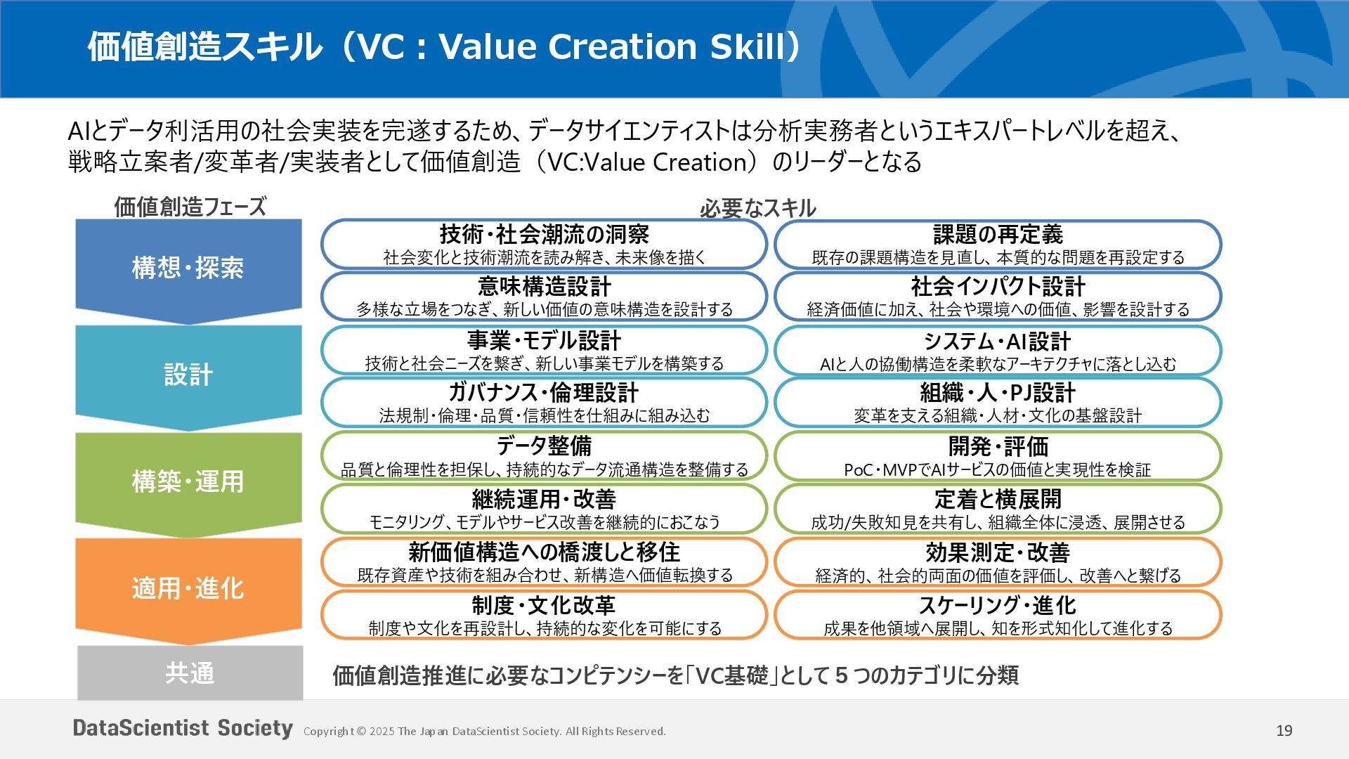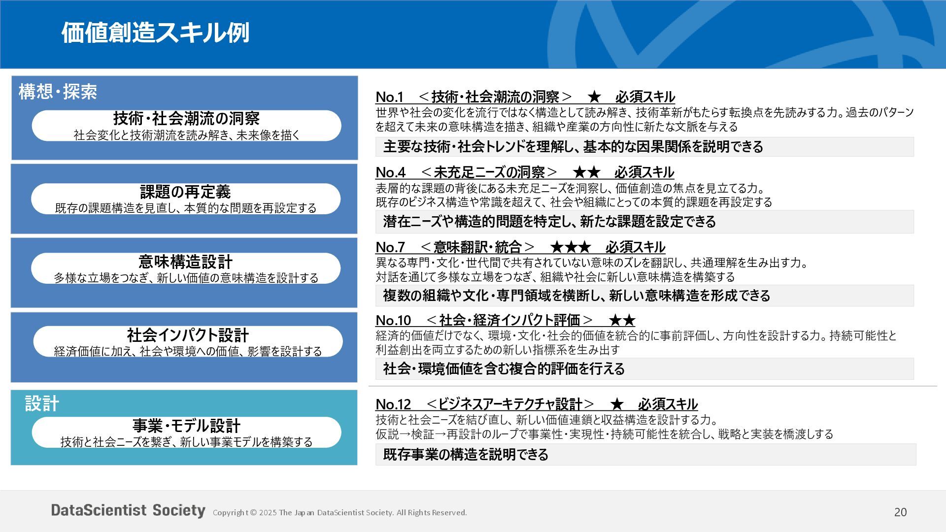 価値創造スキル(VC:Value Creation Skill) 19 構想・探索 設計 構築・運用 適用・進化 技術・社会潮流の洞察 社会変化と技術潮流を読み解き、未来像を描く 課題の再定義 既存の課題構造を見直し、本質的な問題を再設定する 意味構造設計 多様な立場をつなぎ、新しい価値の意味構造を設計する 社会インパクト設計 経済価値に加え、社会や環境への価値、影響を設計する 価値創造推進に必要なコンピテンシーを「VC基礎」として5つのカテゴリに分類 事業・モデル設計 技術と社会ニーズを繋ぎ、新しい事業モデルを構築する システム・AI設計 AIと人の協働構造を柔軟なアーキテクチャに落とし込む ガバナンス・倫理設計 法規制・倫理・品質・信頼性を仕組みに組み込む 組織・人・PJ設計 変革を支える組織・人材・文化の基盤設計 データ整備 品質と倫理性を担保し、持続的なデータ流通構造を整備する 開発・評価 PoC・MVPでAIサービスの価値と実現性を検証 継続運用・改善 モニタリング、モデルやサービス改善を継続的におこなう 定着と横展開 成功/失敗知見を共有し、組織全体に浸透、展開させる 新価値構造への橋渡しと移住 既存資産や技術を組み合わせ、新構造へ価値転換する 効果測定・改善 経済的、社会的両面の価値を評価し、改善へと繋げる 制度・文化改革 制度や文化を再設計し、持続的な変化を可能にする スケーリング・進化 成果を他領域へ展開し、知を形式知化して進化する 必要なスキル AIとデータ利活用の社会実装を完遂するため、データサイエンティストは分析実務者というエキスパートレベルを超え、 戦略立案者/変革者/実装者として価値創造(VC:Value Creation)のリーダーとなる 共通 価値創造フェーズ