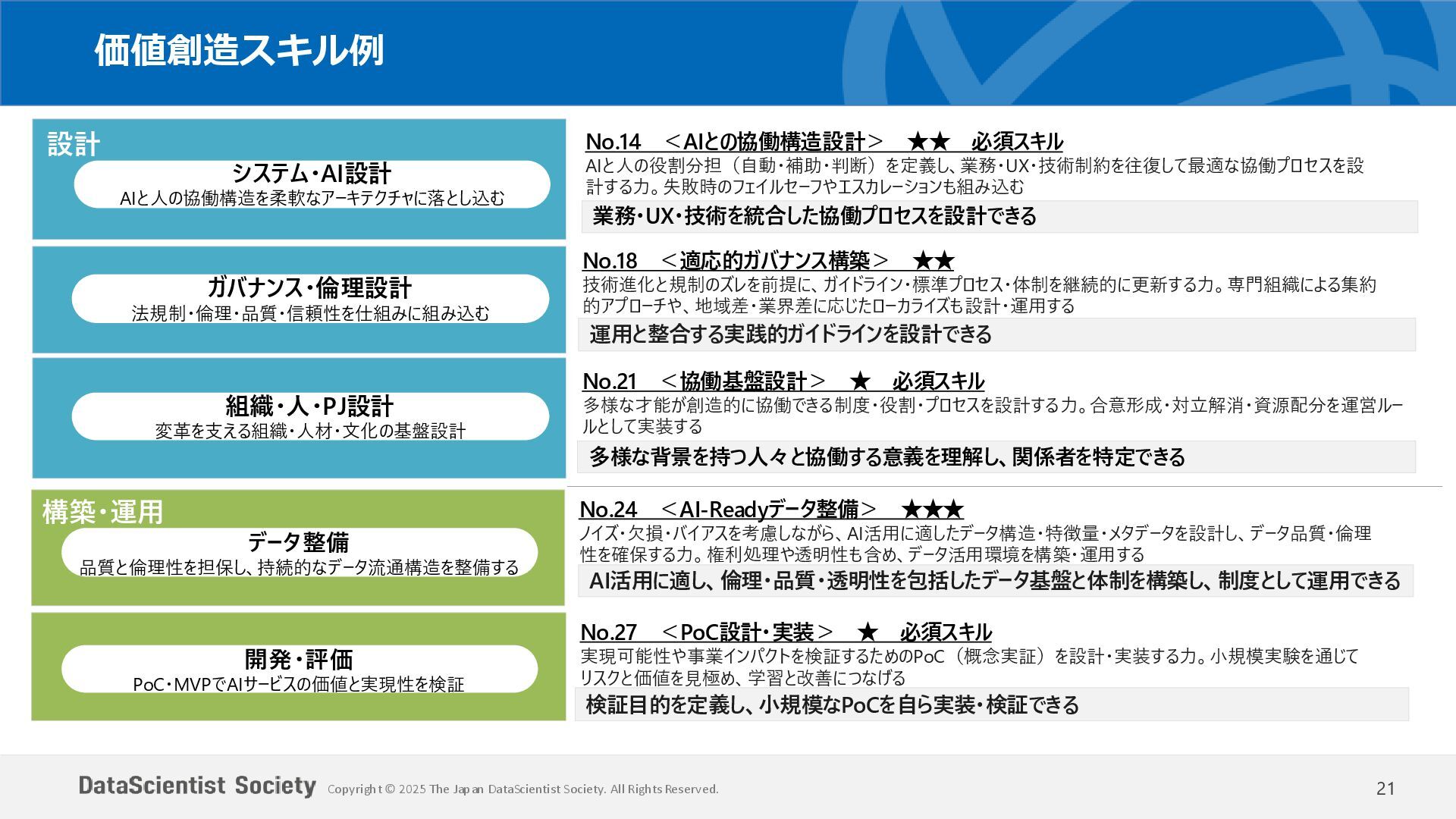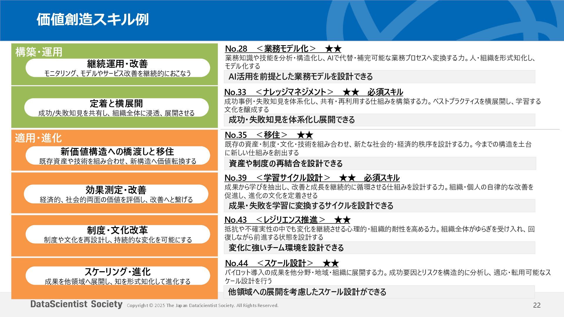 価値創造スキル例 21 構築・運用 データ整備 品質と倫理性を担保し、持続的なデータ流通構造を整備する 開発・評価 PoC・MVPでAIサービスの価値と実現性を検証 設計 ガバナンス・倫理設計 法規制・倫理・品質・信頼性を仕組みに組み込む 組織・人・PJ設計 変革を支える組織・人材・文化の基盤設計 システム・AI設計 AIと人の協働構造を柔軟なアーキテクチャに落とし込む No.14 <AIとの協働構造設計> ★★ 必須スキル AIと人の役割分担(自動・補助・判断)を定義し、業務・UX・技術制約を往復して最適な協働プロセスを設 計する力。失敗時のフェイルセーフやエスカレーションも組み込む 業務・UX・技術を統合した協働プロセスを設計できる No.18 <適応的ガバナンス構築> ★★ 技術進化と規制のズレを前提に、ガイドライン・標準プロセス・体制を継続的に更新する力。専門組織による集約 的アプローチや、地域差・業界差に応じたローカライズも設計・運用する 運用と整合する実践的ガイドラインを設計できる No.21 <協働基盤設計> ★ 必須スキル 多様な才能が創造的に協働できる制度・役割・プロセスを設計する力。合意形成・対立解消・資源配分を運営ルー ルとして実装する 多様な背景を持つ人々と協働する意義を理解し、関係者を特定できる No.24 <AI-Readyデータ整備> ★★★ ノイズ・欠損・バイアスを考慮しながら、AI活用に適したデータ構造・特徴量・メタデータを設計し、データ品質・倫理 性を確保する力。権利処理や透明性も含め、データ活用環境を構築・運用する AI活用に適し、倫理・品質・透明性を包括したデータ基盤と体制を構築し、制度として運用できる No.27 <PoC設計・実装> ★ 必須スキル 実現可能性や事業インパクトを検証するためのPoC(概念実証)を設計・実装する力。小規模実験を通じて リスクと価値を見極め、学習と改善につなげる 検証目的を定義し、小規模なPoCを自ら実装・検証できる
