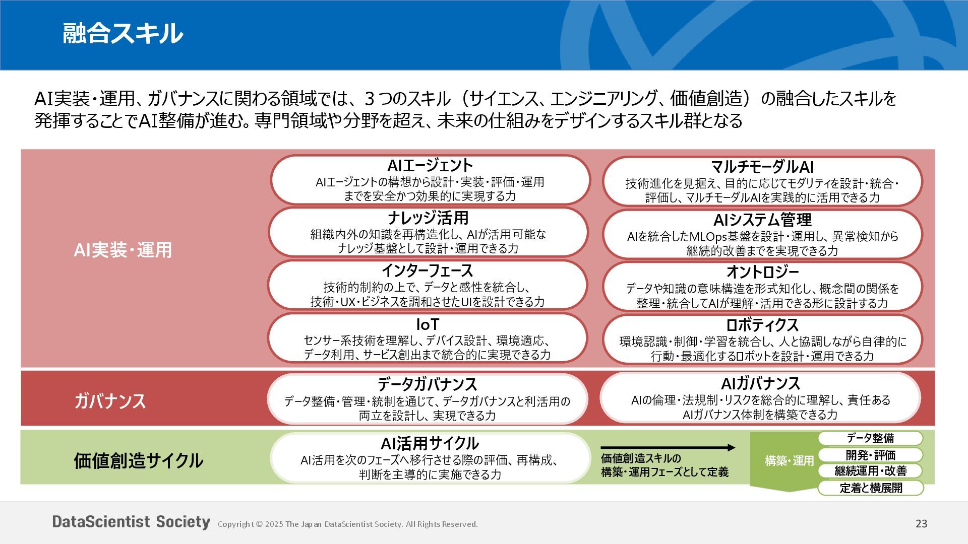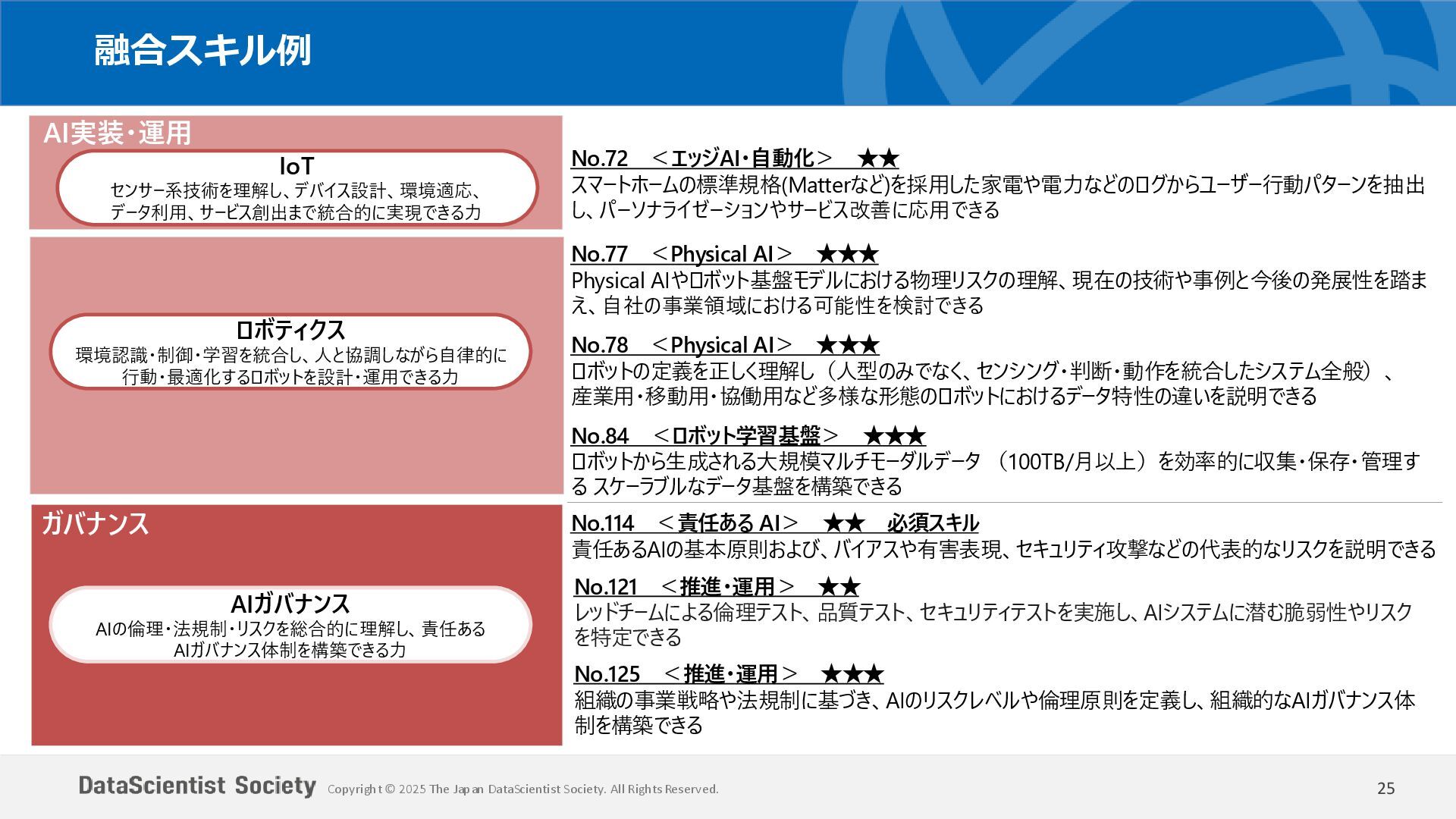 融合スキル 23 AIエージェント AIエージェントの構想から設計・実装・評価・運用 までを安全かつ効果的に実現する力 マルチモーダルAI 技術進化を見据え、目的に応じてモダリティを設計・統合・ 評価し、マルチモーダルAIを実践的に活用できる力 ナレッジ活用 組織内外の知識を再構造化し、AIが活用可能な ナレッジ基盤として設計・運用できる力 AIガバナンス AIの倫理・法規制・リスクを総合的に理解し、責任ある AIガバナンス体制を構築できる力 AIシステム管理 AIを統合したMLOps基盤を設計・運用し、異常検知から 継続的改善までを実現できる力 AI活用サイクル AI活用を次のフェーズへ移行させる際の評価、再構成、 判断を主導的に実施できる力 IoT センサー系技術を理解し、デバイス設計、環境適応、 データ利用、サービス創出まで統合的に実現できる力 ロボティクス 環境認識・制御・学習を統合し、人と協調しながら自律的に 行動・最適化するロボットを設計・運用できる力 データガバナンス データ整備・管理・統制を通じて、データガバナンスと利活用の 両立を設計し、実現できる力 インターフェース 技術的制約の上で、データと感性を統合し、 技術・UX・ビジネスを調和させたUIを設計できる力 オントロジー データや知識の意味構造を形式知化し、概念間の関係を 整理・統合してAIが理解・活用できる形に設計する力 AI実装・運用 ガバナンス 価値創造サイクル 構築・運用 データ整備 開発・評価 継続運用・改善 定着と横展開 AI実装・運用、ガバナンスに関わる領域では、3つのスキル(サイエンス、エンジニアリング、価値創造)の融合したスキルを 発揮することでAI整備が進む。専門領域や分野を超え、未来の仕組みをデザインするスキル群となる 価値創造スキルの 構築・運用フェーズとして定義
