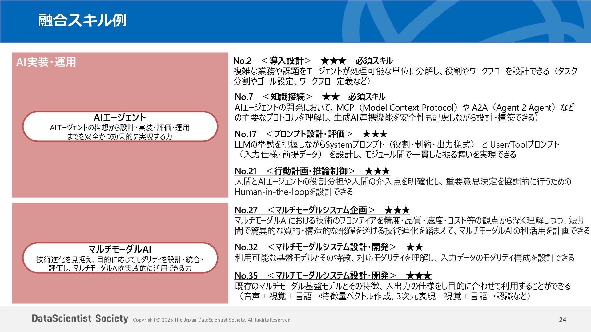 融合スキル例 24 AIエージェント AIエージェントの構想から設計・実装・評価・運用 までを安全かつ効果的に実現する力 AI実装・運用 No.2 <導入設計> ★★★ 必須スキル 複雑な業務や課題をエージェントが処理可能な単位に分解し、役割やワークフローを設計できる(タスク 分割やゴール設定、ワークフロー定義など) No.7 <知識接続> ★★ 必須スキル AIエージェントの開発において、MCP(Model Context Protocol)や A2A(Agent 2 Agent)など の主要なプロトコルを理解し、生成AI連携機能を安全性も配慮しながら設計・構築できる) No.17 <プロンプト設計・評価> ★★★ LLMの挙動を把握しながらSystemプロンプト(役割・制約・出力様式) と User/Toolプロンプト (入力仕様・前提データ) を設計し、モジュール間で一貫した振る舞いを実現できる No.21 <行動計画・推論制御> ★★★ 人間とAIエージェントの役割分担や人間の介入点を明確化し、重要意思決定を協調的に行うための Human-in-the-loopを設計できる No.32 <マルチモーダルシステム設計・開発> ★★ 利用可能な基盤モデルとその特徴、対応モダリティを理解し、入力データのモダリティ構成を設計できる No.35 <マルチモーダルシステム設計・開発> ★★★ 既存のマルチモーダル基盤モデルとその特徴、入出力の仕様をし目的に合わせて利用することができる (音声+視覚+言語→特徴量ベクトル作成、3次元表現+視覚+言語→認識など) マルチモーダルAI 技術進化を見据え、目的に応じてモダリティを設計・統合・ 評価し、マルチモーダルAIを実践的に活用できる力 No.27 <マルチモーダルシステム企画> ★★★ マルチモーダルAIにおける技術のフロンティアを精度・品質・速度・コスト等の観点から深く理解しつつ、短期 間で驚異的な質的・構造的な飛躍を遂げる技術進化を踏まえて、マルチモーダルAIの利活用を計画できる