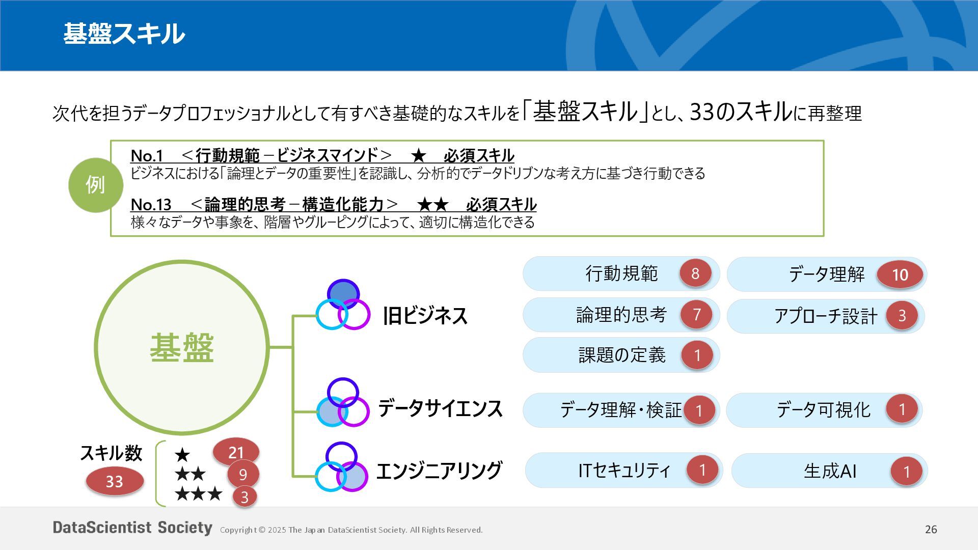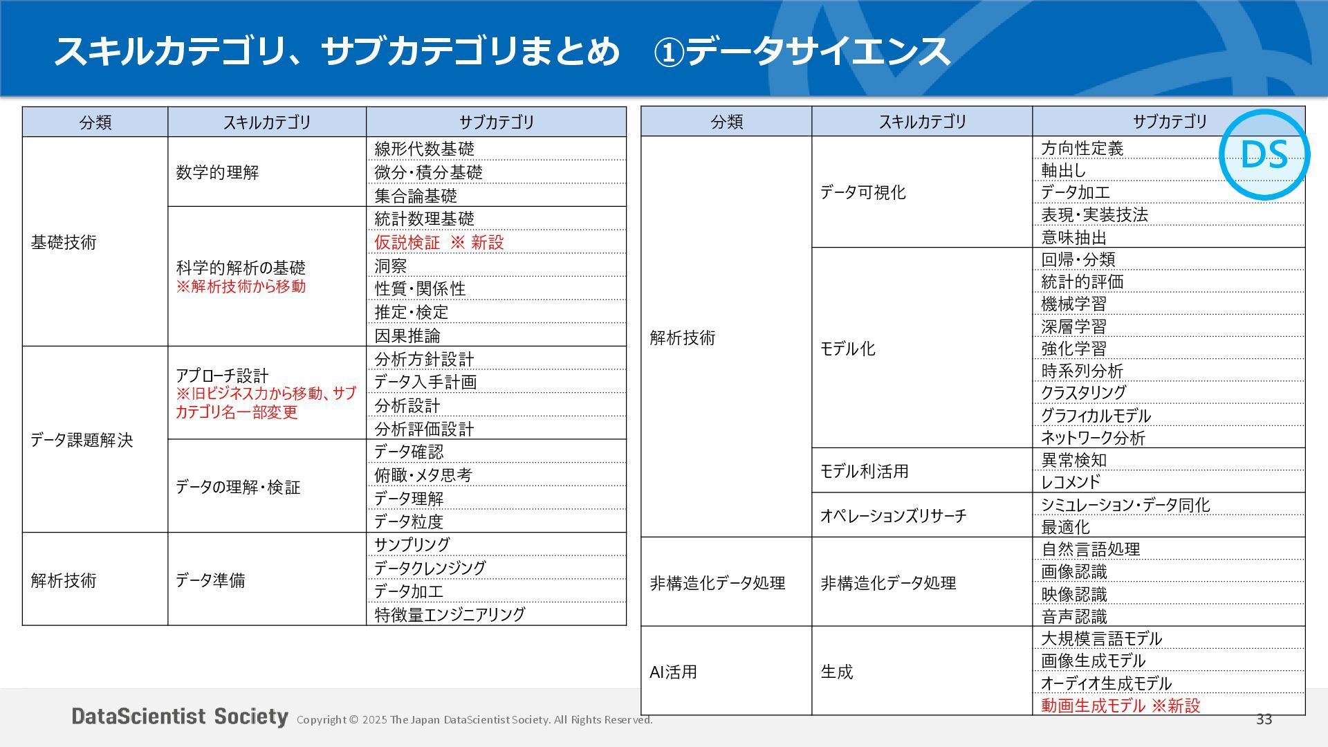① 生成AI・基盤モデルへの対応強化 ② 各モダリティ処理の高度化対応 ④ カテゴリ構造の整理 資料:データサイエンティスト協会スキル定義委員会討議 拡散モデル理解 LLM構造理解 AI活用設計・評価 動画生成 LLMの構造・学習手順 (RLHF, RLAIF 等)への理解 テキスト・画像・音声・動画など 多様な生成モデルの特徴理解 システムへの組み込み・改善や 評価手法(LLM-as-a-Judge等) 動画生成AIサブカテゴリ新設 科学的解析の基礎 分類軸の追加 音声認識 画像認識 動画認識 Whisper 等の音声基盤モデル 3D-CNN、時空間Transformer などによる動画時空間認識 CLIP等によるZero-shot画像認識 因果推論 仮説検証 アプローチ設計 ③ AI時代の実践的問題設定・検証への対応 アップデートの詳細と例 ①データサイエンス 課題を分析可能な仮説へ 落とし込むスキル 因果構造を踏まえた 実践的推定に関するスキル AI時代に必要な分析方針設計を 旧ビジネス領域から移管 基礎技術〜AI活用の軸に もとづくカテゴリ構造を整理 AI時代の「土台」スキルとして “解析技術”から“基礎技術”へ再配置 32 強化学習理解 生成AIやロボティクスの進化を 踏まえた強化学習スキル DS