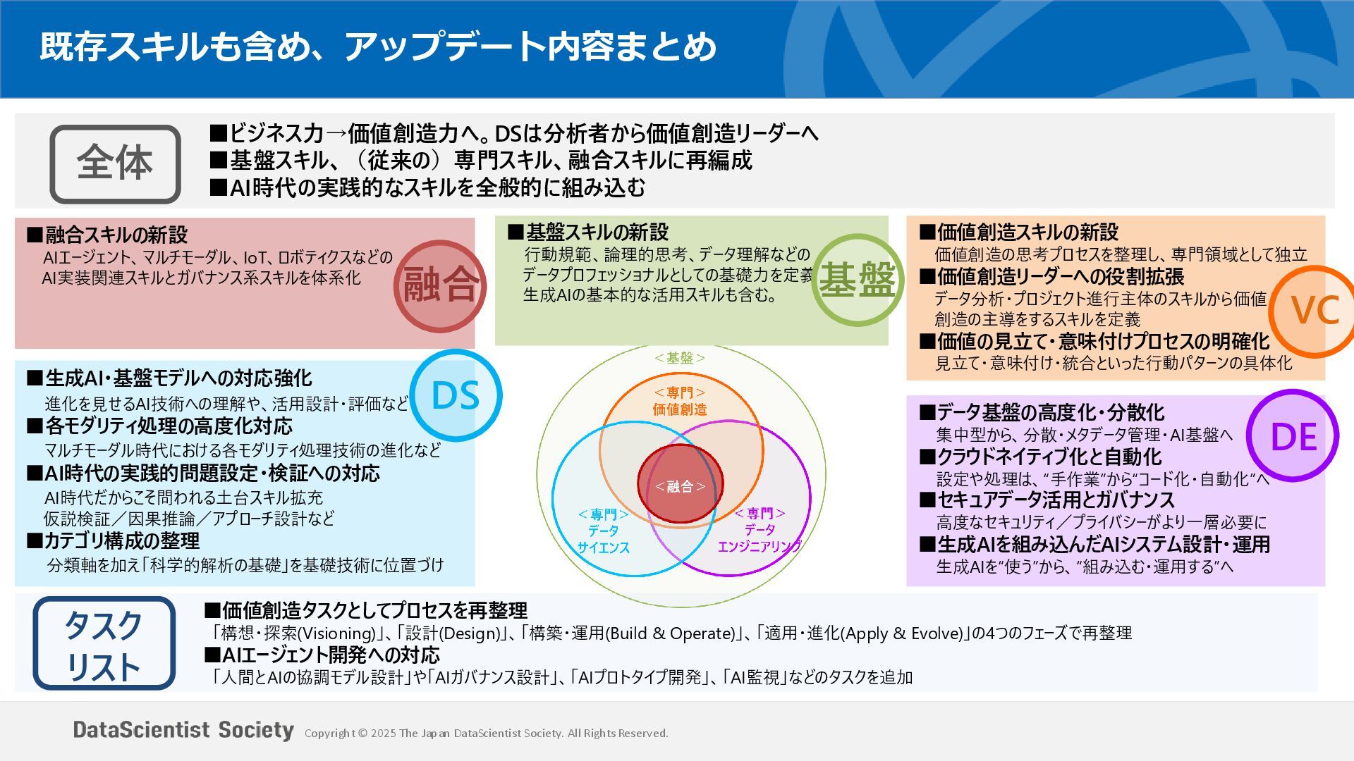 ▪価値創造タスクとしてプロセスを再整理 「構想・探索(Visioning)」、「設計(Design)」、「構築・運用(Build & Operate)」、「適用・進化(Apply & Evolve)」の4つのフェーズで再整理 ▪AIエージェント開発への対応 「人間とAIの協調モデル設計」や「AIガバナンス設計」、「AIプロトタイプ開発」、「AI監視」などのタスクを追加 既存スキルも含め、アップデート内容まとめ タスク リスト ▪データ基盤の高度化・分散化 集中型から、分散・メタデータ管理・AI基盤へ ▪クラウドネイティブ化と自動化 設定や処理は、“手作業”から“コード化・自動化”へ ▪セキュアデータ活用とガバナンス 高度なセキュリティ/プライバシーがより一層必要に ▪生成AIを組み込んだAIシステム設計・運用 生成AIを“使う”から、“組み込む・運用する”へ ▪生成AI・基盤モデルへの対応強化 進化を見せるAI技術への理解や、活用設計・評価など ▪各モダリティ処理の高度化対応 マルチモーダル時代における各モダリティ処理技術の進化など ▪AI時代の実践的問題設定・検証への対応 AI時代だからこそ問われる土台スキル拡充 仮説検証/因果推論/アプローチ設計など ▪カテゴリ構成の整理 分類軸を加え「科学的解析の基礎」を基礎技術に位置づけ ▪ビジネス力→価値創造力へ。DSは分析者から価値創造リーダーへ ▪基盤スキル、(従来の)専門スキル、融合スキルに再編成 ▪AI時代の実践的なスキルを全般的に組み込む ▪基盤スキルの新設 行動規範、論理的思考、データ理解などの データプロフェッショナルとしての基礎力を定義 生成AIの基本的な活用スキルも含む。 ▪融合スキルの新設 AIエージェント、マルチモーダル、IoT、ロボティクスなどの AI実装関連スキルとガバナンス系スキルを体系化 ▪価値創造スキルの新設 価値創造の思考プロセスを整理し、専門領域として独立 ▪価値創造リーダーへの役割拡張 データ分析・プロジェクト進行主体のスキルから価値 創造の主導をするスキルを定義 ▪価値の見立て・意味付けプロセスの明確化 見立て・意味付け・統合といった行動パターンの具体化 全体 融合 基盤 VC DE DS