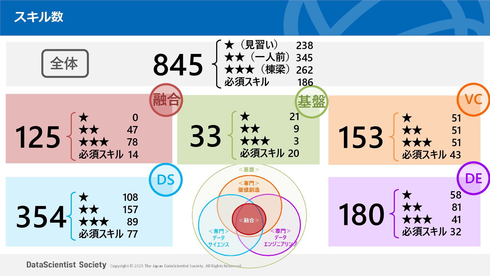 スキル数 全体 33 ★ ★★ ★★★ 必須スキル 21 9 3 20 125 ★ ★★ ★★★ 必須スキル 0 47 78 14 354 ★ ★★ ★★★ 必須スキル 108 157 89 77 180 ★ ★★ ★★★ 必須スキル 58 81 41 32 153 ★ ★★ ★★★ 必須スキル 51 51 51 43 融合 基盤 VC DE DS 845 ★(見習い) ★★(一人前) ★★★(棟梁) 必須スキル 238 345 262 186