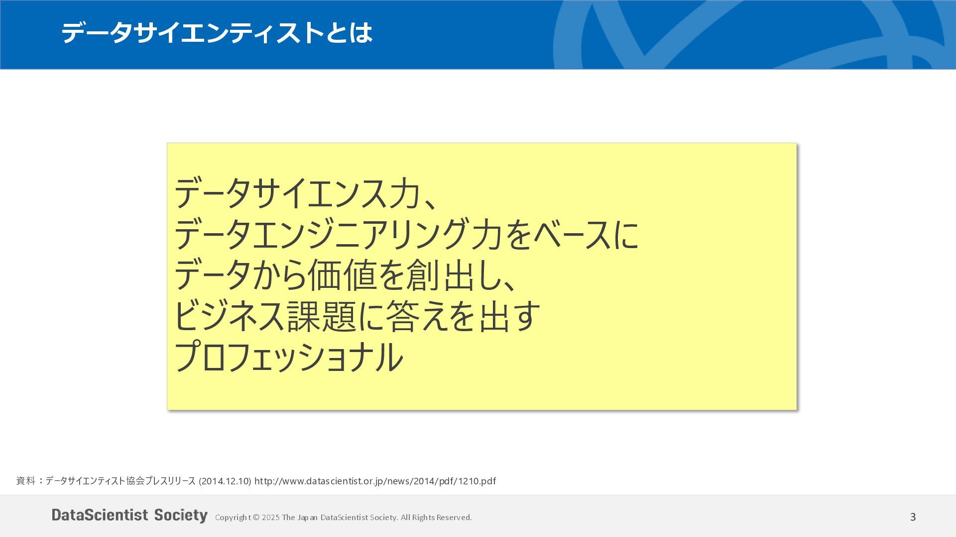 スキル定義委員会とは・・・ 2 設立時の状況 ・バズワードである「データサイエンティスト」 という言葉の定義が欠落 ・雇い主側の期待に雇われる側のスキルセットが 合致しないケースが増加 ・若い才能たちが、自分達をどう訓練し、 スキルを身に着けていくべきかわからない 設立の目的 ・このデータプロフェッショナルのみなさんが 相互に接し、やりとりできるオープンな環境を 提供する ・社会との対話を行う ・この新しいデータプロフェッショナル (「データサイエンティスト」)に必要 とされるスキルセットを定義する ・スキル育成と評価のための軸・基準を 作る
