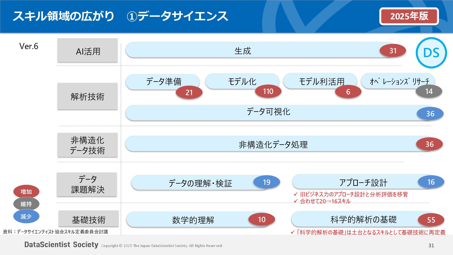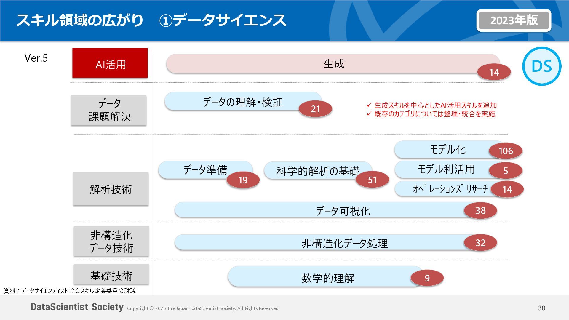 スキル領域の広がり ①データサイエンス 30 2023年版 数学的理解 科学的解析の基礎 データ準備 モデル化 基礎技術 解析技術 非構造化 データ技術 オペレーションズリサーチ データ可視化 データの理解・検証 データ 課題解決 生成 9 51 19 21 14 14 資料:データサイエンティスト協会スキル定義委員会討議 Ver.5 106 非構造化データ処理 モデル利活用 5 32 38 AI活用 ✓ 生成スキルを中心としたAI活用スキルを追加 ✓ 既存のカテゴリについては整理・統合を実施 DS