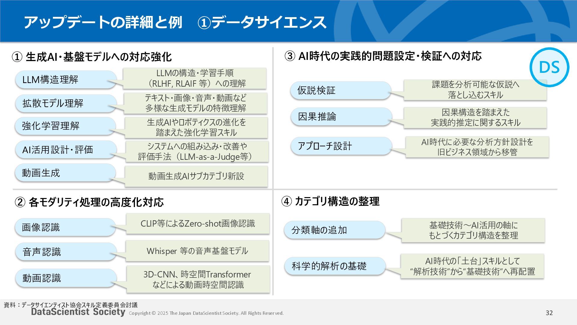 スキル領域の広がり ①データサイエンス 31 2025年版 資料:データサイエンティスト協会スキル定義委員会討議 数学的理解 科学的解析の基礎 データ準備 モデル化 基礎技術 解析技術 非構造化 データ技術 オペレーションズリサーチ データ可視化 データの理解・検証 データ 課題解決 生成 10 55 21 19 31 14 Ver.6 110 非構造化データ処理 モデル利活用 6 36 36 AI活用 アプローチ設計 ✓ 旧ビジネス力のアプローチ設計と分析評価を移管 ✓ 合わせて20→16スキル 16 ✓ 「科学的解析の基礎」は土台となるスキルとして基礎技術に再定義 増加 維持 減少 DS