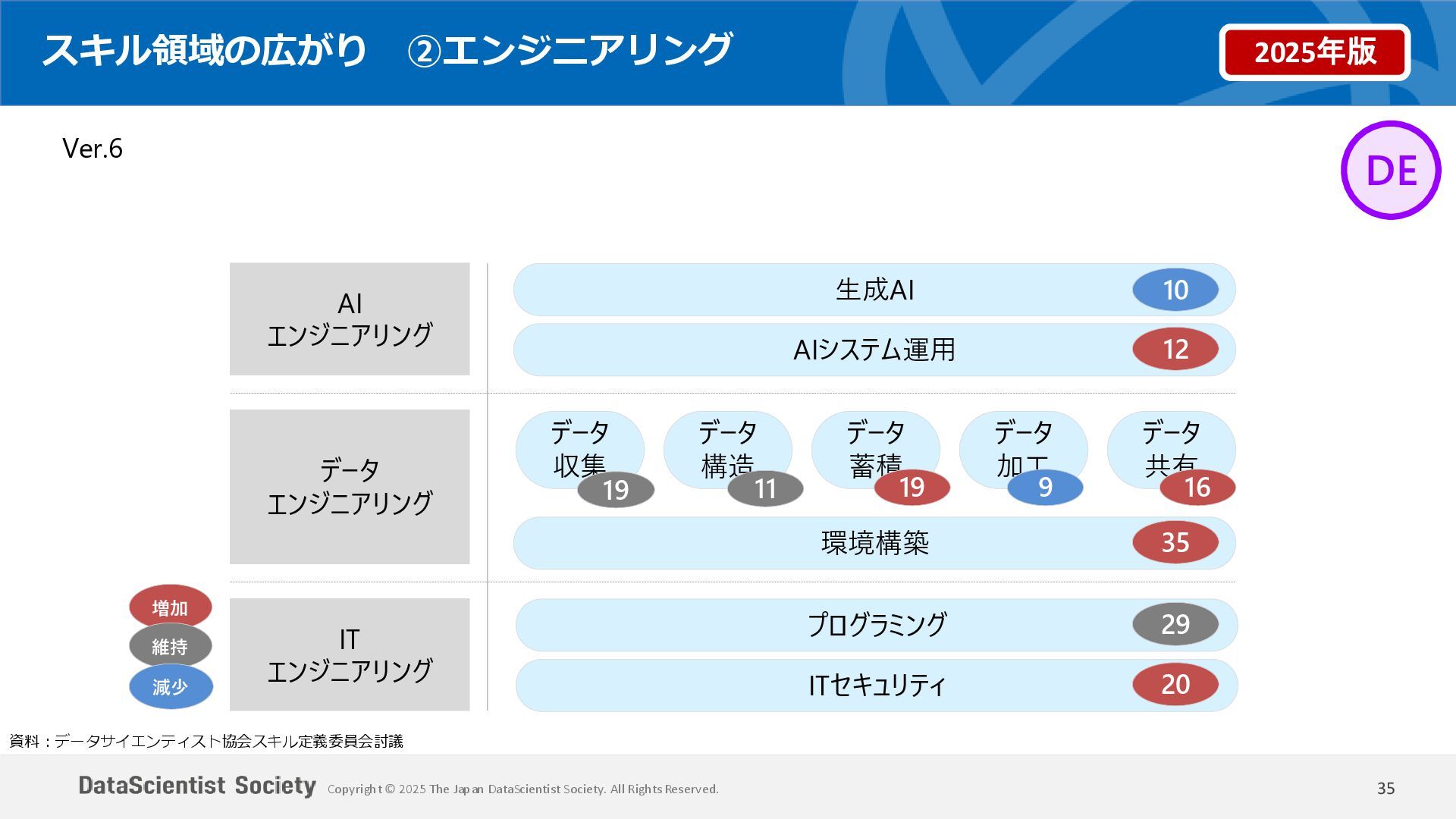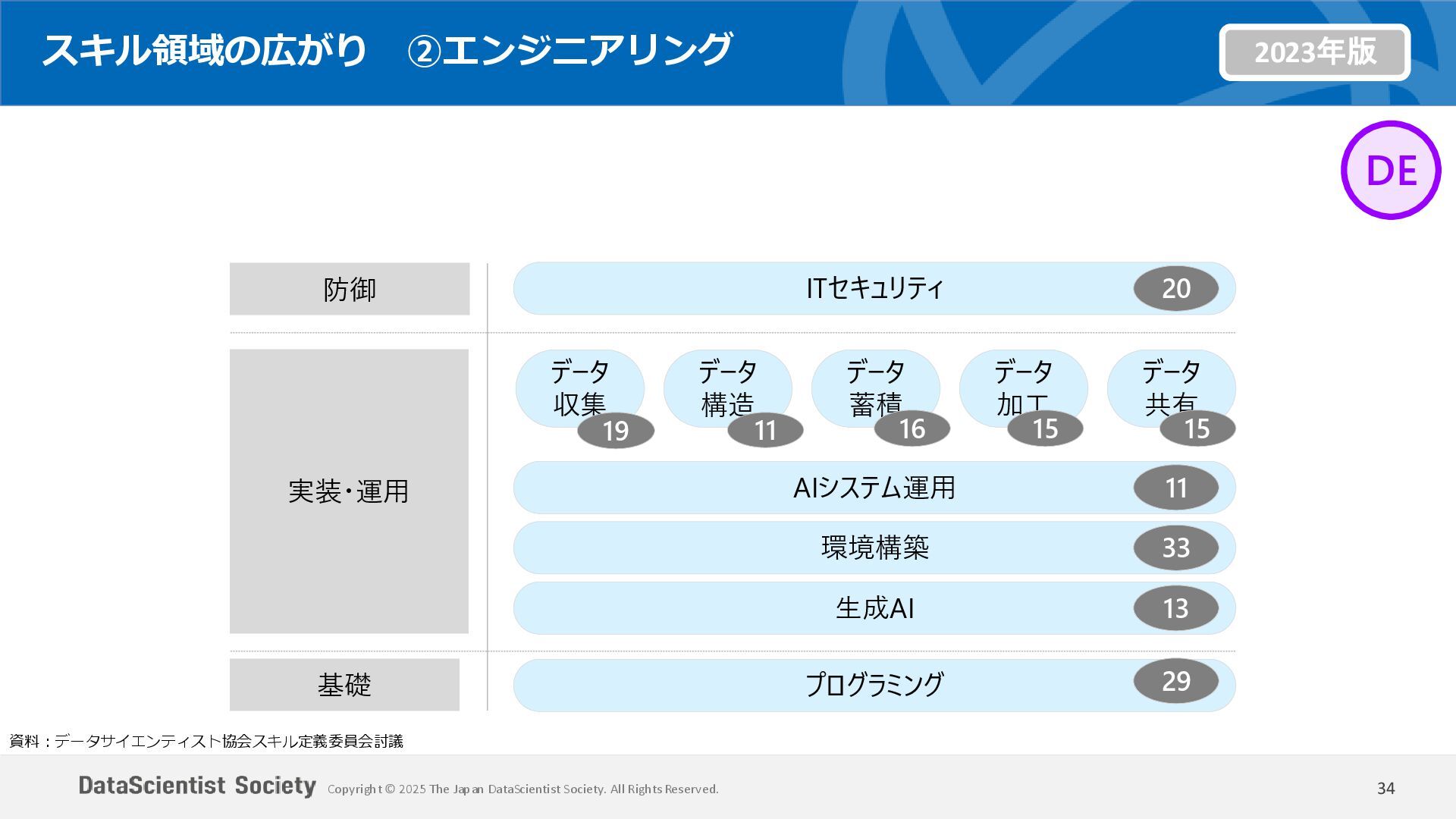 データ 収集 データ 蓄積 データ 加工 データ 構造 データ 共有 スキル領域の広がり ②エンジニアリング 34 生成AI 実装・運用 基礎 防御 プログラミング ITセキュリティ 13 29 20 19 11 16 15 15 2023年版 資料:データサイエンティスト協会スキル定義委員会討議 AIシステム運用 11 環境構築 33 DE