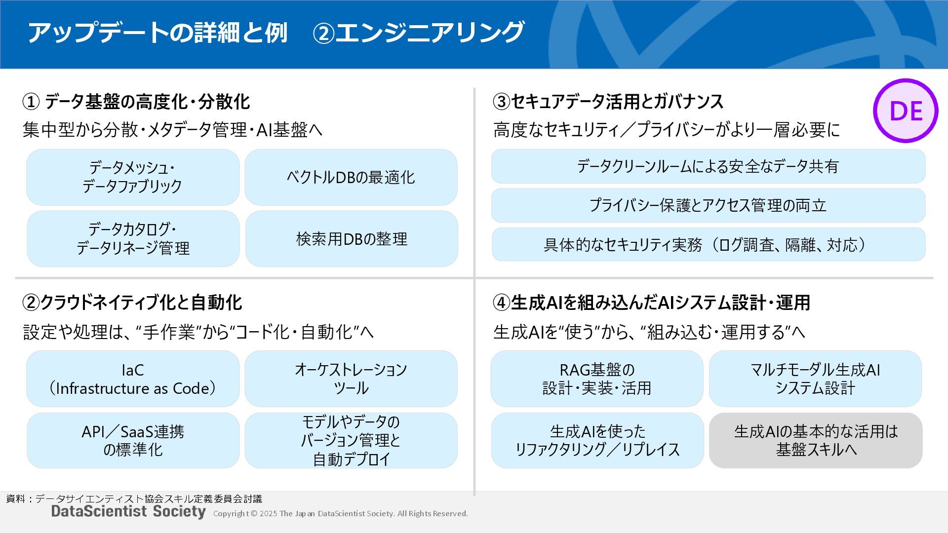 ① データ基盤の高度化・分散化 ③セキュアデータ活用とガバナンス 集中型から分散・メタデータ管理・AI基盤へ アップデートの詳細と例 ②エンジニアリング ②クラウドネイティブ化と自動化 設定や処理は、“手作業”から“コード化・自動化”へ 高度なセキュリティ/プライバシーがより一層必要に ④生成AIを組み込んだAIシステム設計・運用 資料:データサイエンティスト協会スキル定義委員会討議 データメッシュ・ データファブリック 生成AIを“使う”から、“組み込む・運用する”へ データカタログ・ データリネージ管理 ベクトルDBの最適化 検索用DBの整理 IaC (Infrastructure as Code) オーケストレーション ツール API/SaaS連携 の標準化 モデルやデータの バージョン管理と 自動デプロイ データクリーンルームによる安全なデータ共有 プライバシー保護とアクセス管理の両立 具体的なセキュリティ実務(ログ調査、隔離、対応) RAG基盤の 設計・実装・活用 生成AIを使った リファクタリング/リプレイス マルチモーダル生成AI システム設計 生成AIの基本的な活用は 基盤スキルへ DE