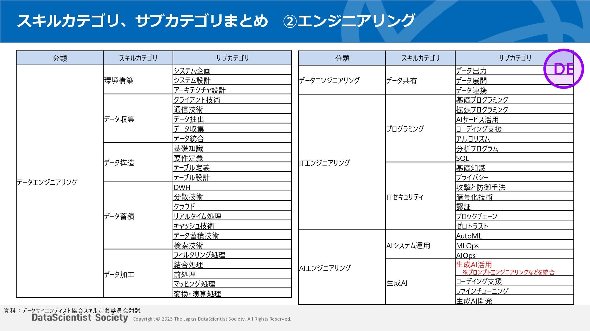 スキルカテゴリ、サブカテゴリまとめ ②エンジニアリング 資料:データサイエンティスト協会スキル定義委員会討議 分類 スキルカテゴリ サブカテゴリ データエンジニアリング 環境構築 システム企画 システム設計 アーキテクチャ設計 データ収集 クライアント技術 通信技術 データ抽出 データ収集 データ統合 データ構造 基礎知識 要件定義 テーブル定義 テーブル設計 データ蓄積 DWH 分散技術 クラウド リアルタイム処理 キャッシュ技術 データ蓄積技術 検索技術 データ加工 フィルタリング処理 結合処理 前処理 マッピング処理 変換・演算処理 分類 スキルカテゴリ サブカテゴリ データエンジニアリング データ共有 データ出力 データ展開 データ連携 ITエンジニアリング プログラミング 基礎プログラミング 拡張プログラミング AIサービス活用 コーディング支援 アルゴリズム 分析プログラム SQL ITセキュリティ 基礎知識 プライバシー 攻撃と防御手法 暗号化技術 認証 ブロックチェーン ゼロトラスト AIエンジニアリング AIシステム運用 AutoML MLOps AIOps 生成AI 生成AI活用 ※プロンプトエンジニアリングなどを統合 コーディング支援 ファインチューニング 生成AI開発 DE
