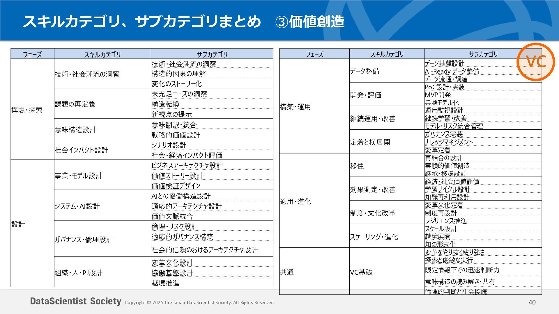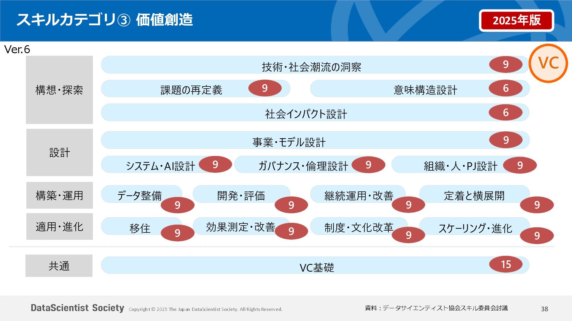 スキルカテゴリ③ 価値創造 38 2025年版 資料:データサイエンティスト協会スキル委員会討議 VC基礎 15 共通 構築・運用 効果測定・改善 制度・文化改革 スケーリング・進化 9 9 9 継続運用・改善 開発・評価 移住 定着と横展開 9 9 9 9 適用・進化 設計 データ整備 システム・AI設計 9 9 構想・探索 課題の再定義 社会インパクト設計 事業・モデル設計 意味構造設計 9 技術・社会潮流の洞察 9 6 6 9 ガバナンス・倫理設計 組織・人・PJ設計 9 9 Ver.6 VC