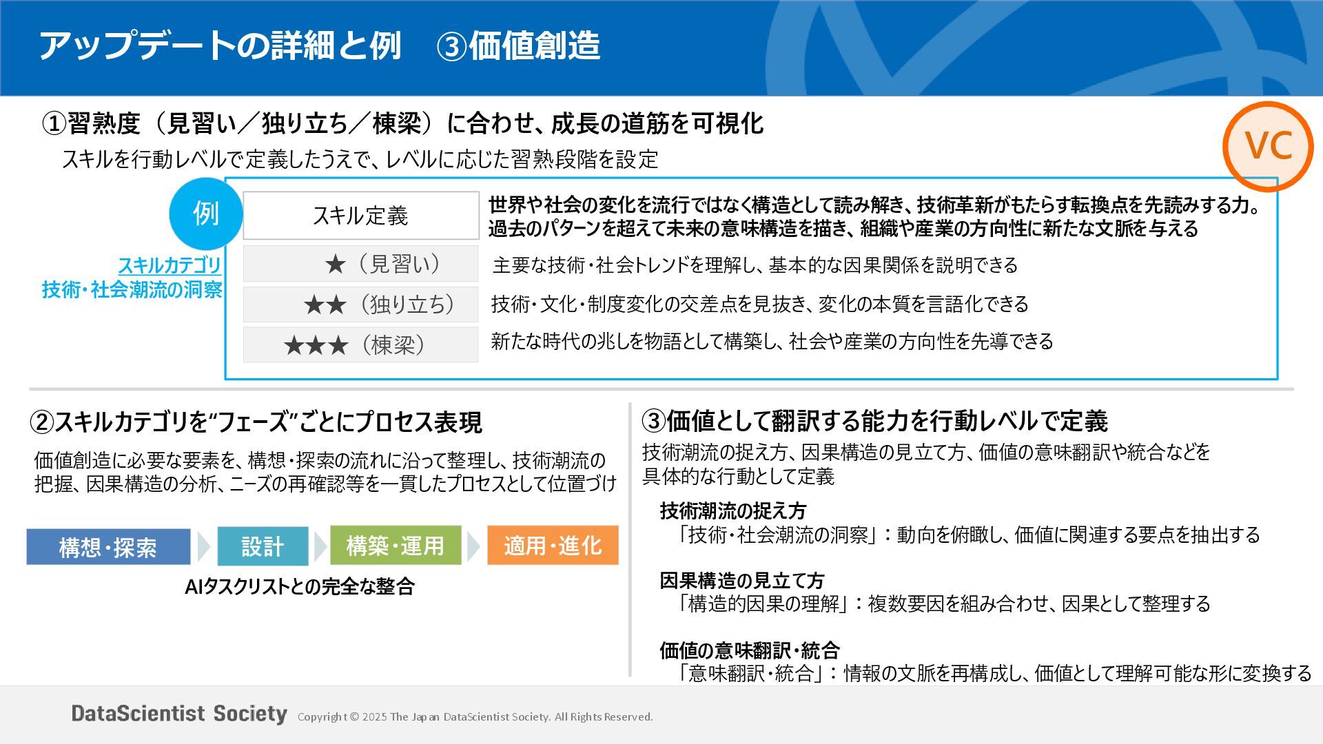 ②スキルカテゴリを“フェーズ”ごとにプロセス表現 ①習熟度(見習い/独り立ち/棟梁)に合わせ、成長の道筋を可視化 アップデートの詳細と例 ③価値創造 ③価値として翻訳する能力を行動レベルで定義 ★(見習い) ★★(独り立ち) ★★★(棟梁) スキルを行動レベルで定義したうえで、レベルに応じた習熟段階を設定 世界や社会の変化を流行ではなく構造として読み解き、技術革新がもたらす転換点を先読みする力。 過去のパターンを超えて未来の意味構造を描き、組織や産業の方向性に新たな文脈を与える スキル定義 主要な技術・社会トレンドを理解し、基本的な因果関係を説明できる 技術・文化・制度変化の交差点を見抜き、変化の本質を言語化できる 新たな時代の兆しを物語として構築し、社会や産業の方向性を先導できる 価値創造に必要な要素を、構想・探索の流れに沿って整理し、技術潮流の 把握、因果構造の分析、ニーズの再確認等を一貫したプロセスとして位置づけ 構想・探索 設計 構築・運用 適用・進化 技術潮流の捉え方、因果構造の見立て方、価値の意味翻訳や統合などを 具体的な行動として定義 技術潮流の捉え方 「技術・社会潮流の洞察」:動向を俯瞰し、価値に関連する要点を抽出する 因果構造の見立て方 「構造的因果の理解」:複数要因を組み合わせ、因果として整理する 価値の意味翻訳・統合 「意味翻訳・統合」:情報の文脈を再構成し、価値として理解可能な形に変換する 例 スキルカテゴリ 技術・社会潮流の洞察 AIタスクリストとの完全な整合 VC
