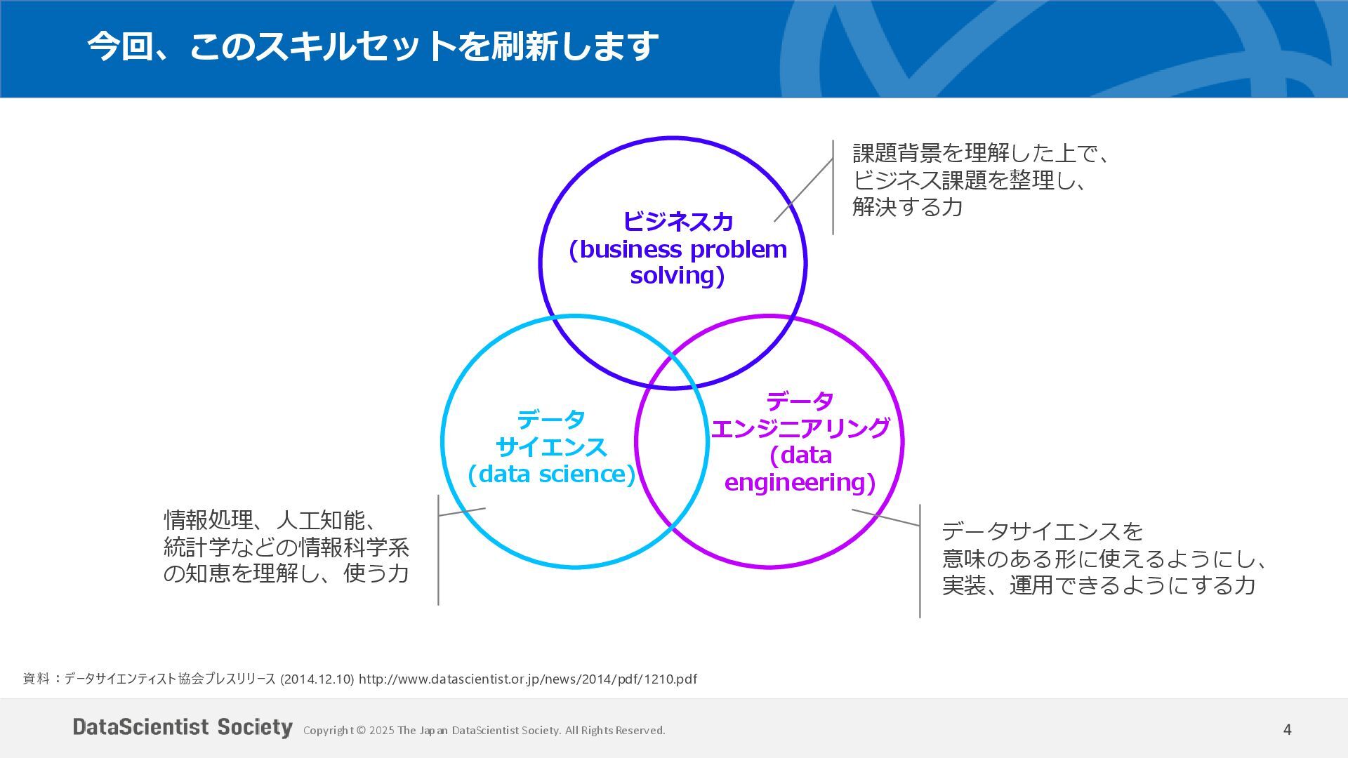 データサイエンティストとは 3 データサイエンス力、 データエンジニアリング力をベースに データから価値を創出し、 ビジネス課題に答えを出す プロフェッショナル 資料:データサイエンティスト協会プレスリリース (2014.12.10) http://www.datascientist.or.jp/news/2014/pdf/1210.pdf