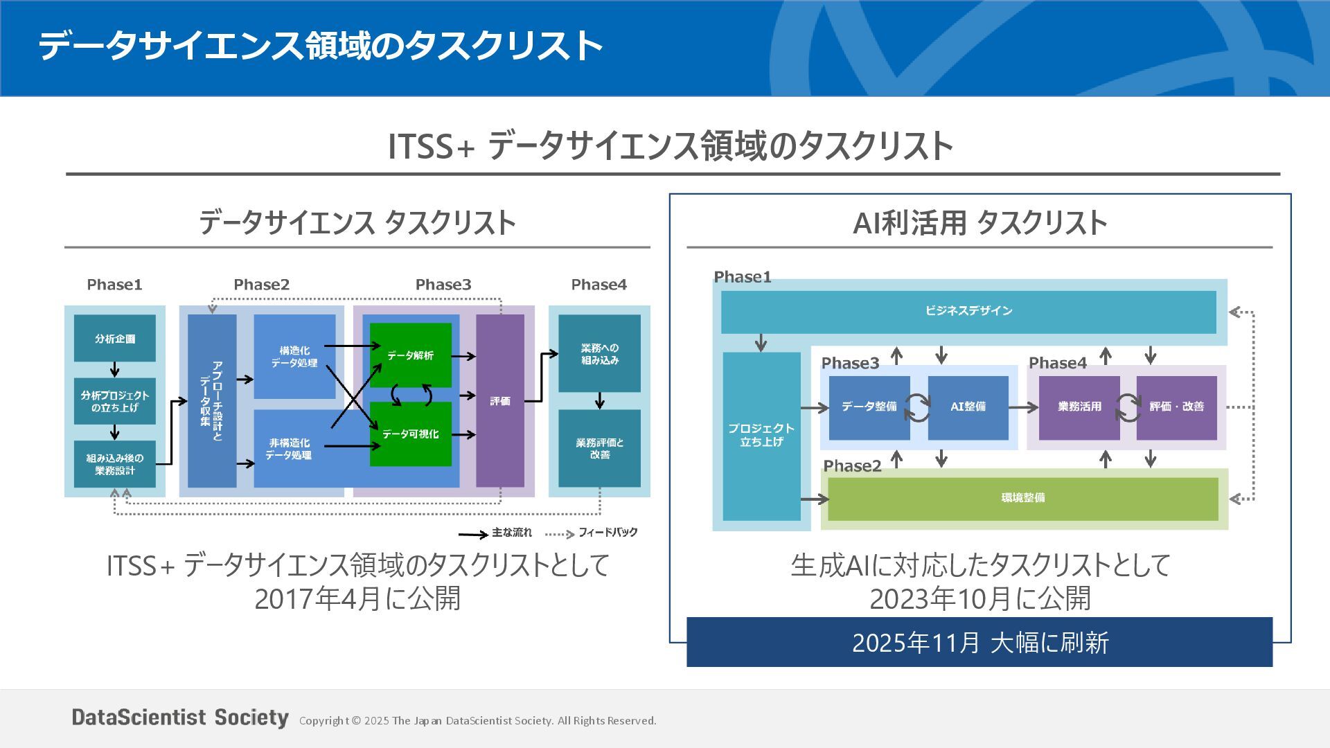 データサイエンス領域のタスクリスト データサイエンス タスクリスト AI利活用 タスクリスト ITSS+ データサイエンス領域のタスクリスト ITSS+ データサイエンス領域のタスクリストとして 2017年4月に公開 生成AIに対応したタスクリストとして 2023年10月に公開 2025年11月 大幅に刷新