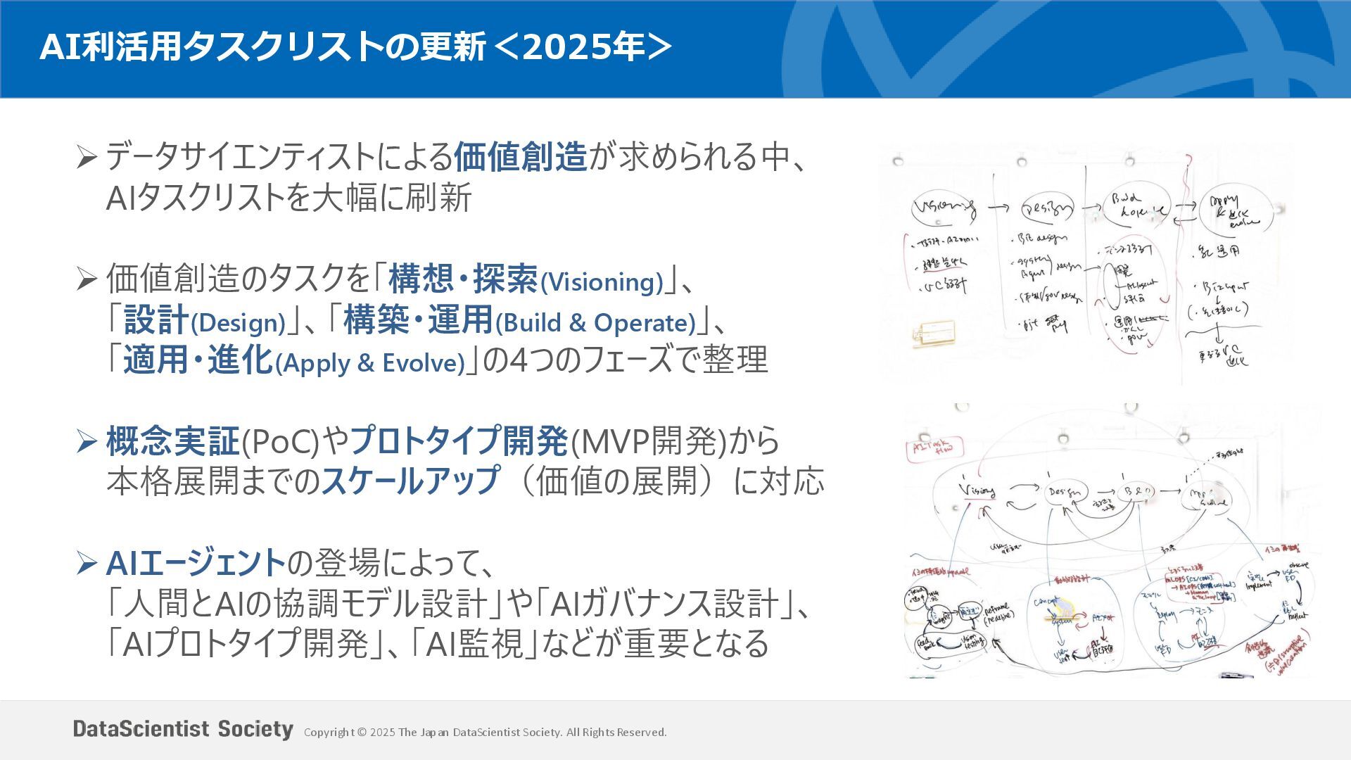 AI利活用タスクリストの更新<2025年> ➢データサイエンティストによる価値創造が求められる中、 AIタスクリストを大幅に刷新 ➢価値創造のタスクを「構想・探索(Visioning)」、 「設計(Design)」、「構築・運用(Build & Operate)」、 「適用・進化(Apply & Evolve)」の4つのフェーズで整理 ➢概念実証(PoC)やプロトタイプ開発(MVP開発)から 本格展開までのスケールアップ(価値の展開)に対応 ➢AIエージェントの登場によって、 「人間とAIの協調モデル設計」や「AIガバナンス設計」、 「AIプロトタイプ開発」、「AI監視」などが重要となる