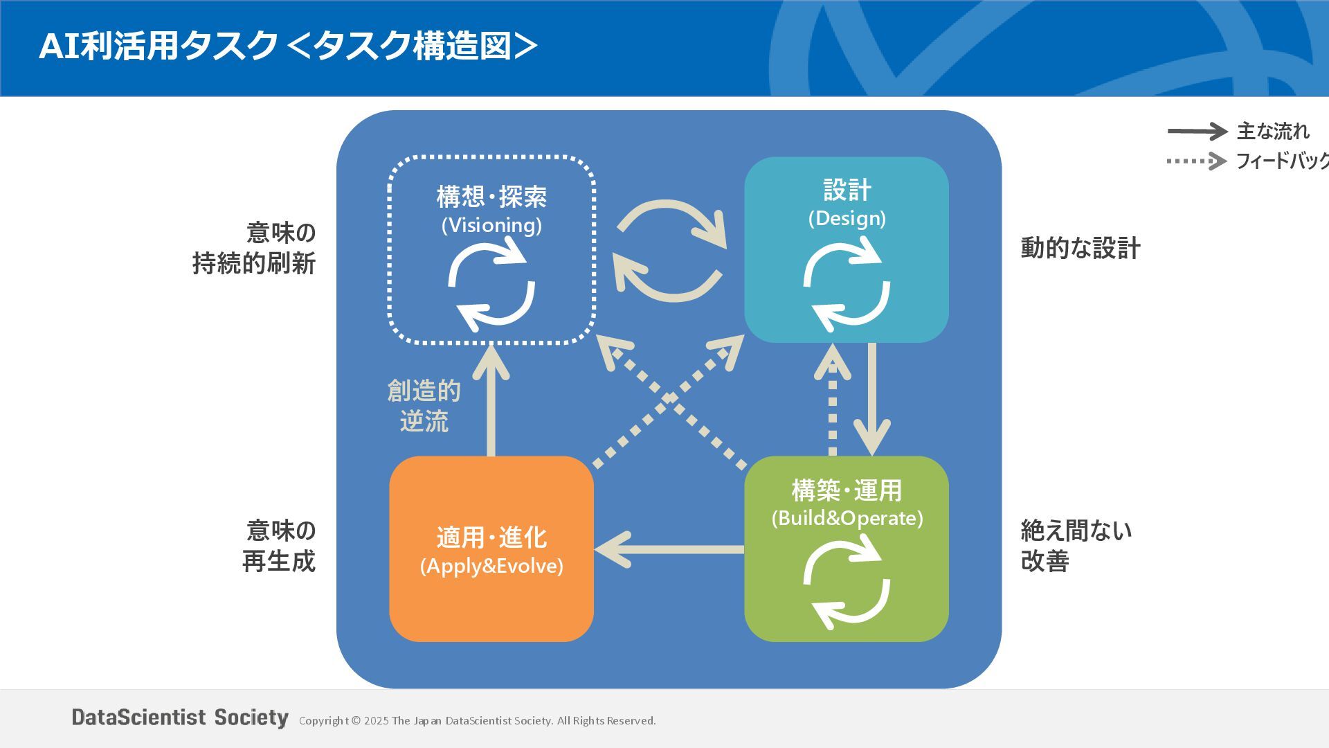 AI利活用タスク<タスク構造図> 設計 (Design) 構築・運用 (Build&Operate) 適用・進化 (Apply&Evolve) 構想・探索 (Visioning) 創造的 逆流 意味の 持続的刷新 動的な設計 絶え間ない 改善 意味の 再生成 主な流れ フィードバック
