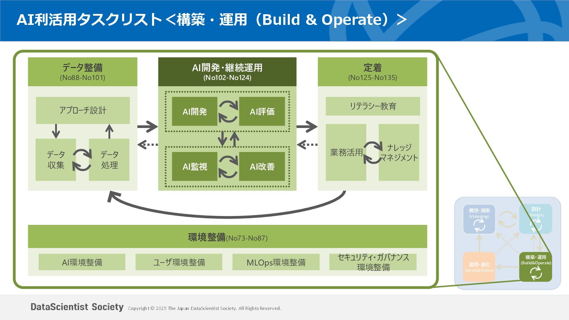 AI利活用タスクリスト<構築・運用(Build & Operate)> 設計 (Design) 構築・運用 (Build&Operate) 適用・進化 (Apply&Evolve) 構想・探索 (Visioning) 環境整備(No73-No87) AI環境整備 ユーザ環境整備 MLOps環境整備 セキュリティ・ガバナンス 環境整備 データ整備 (No88-No101) アプローチ設計 データ 処理 データ 収集 定着 (No125-No135) リテラシー教育 業務活用 ナレッジ マネジメント AI開発・継続運用 (No102-No124) AI監視 AI改善 AI開発 AI評価