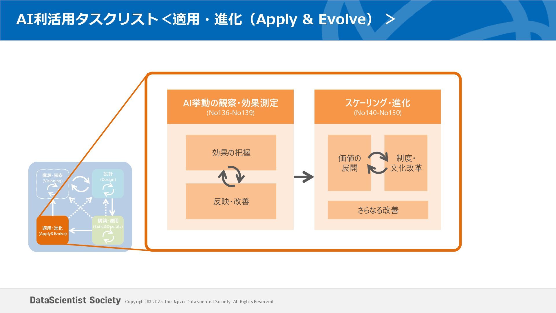 AI利活用タスクリスト<適用・進化(Apply & Evolve) > 設計 (Design) 構築・運用 (Build&Operate) 適用・進化 (Apply&Evolve) 構想・探索 (Visioning) スケーリング・進化 (No140-No150) さらなる改善 価値の 展開 制度・ 文化改革 AI挙動の観察・効果測定 (No136-No139) 反映・改善 効果の把握