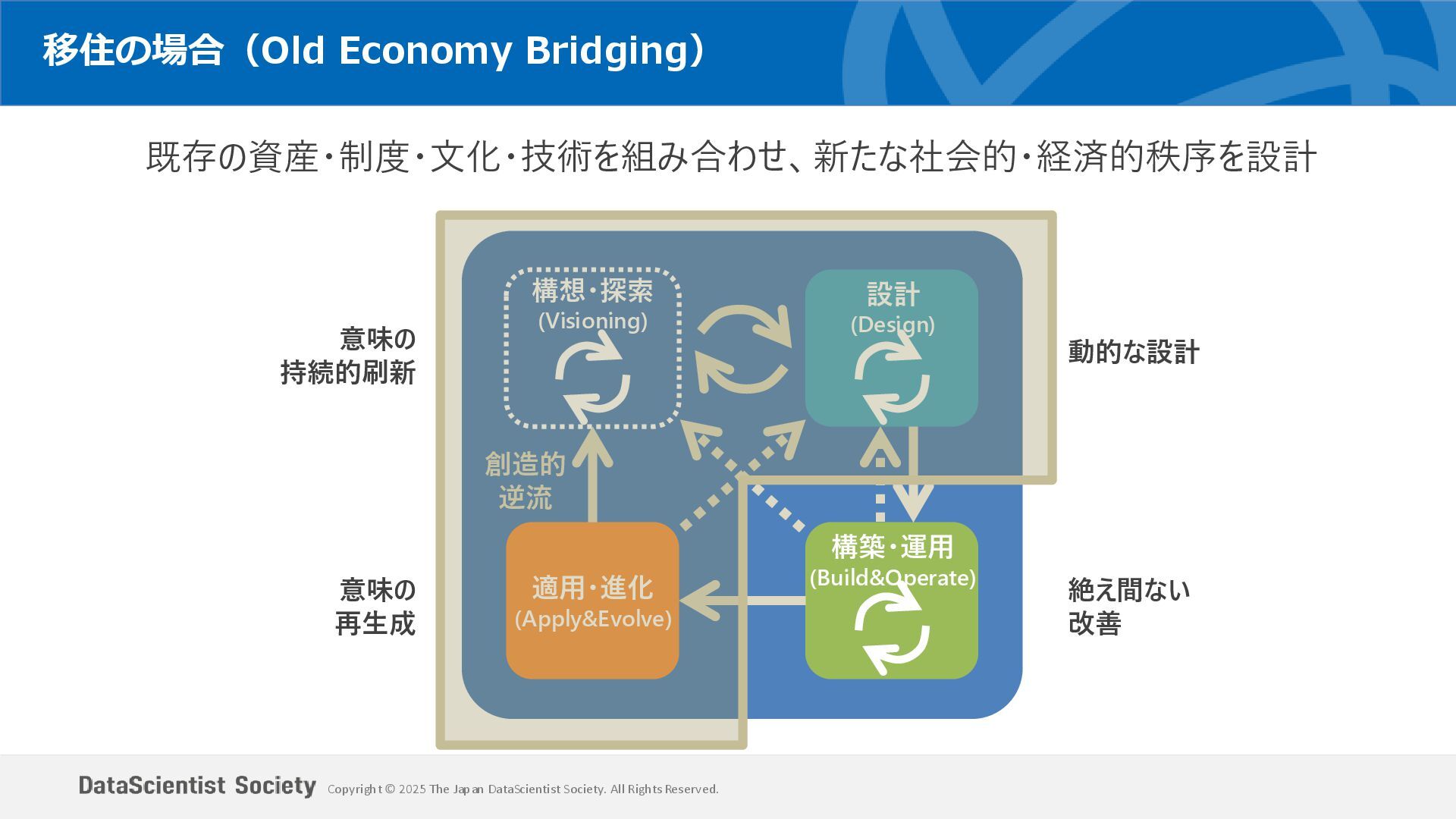 移住の場合(Old Economy Bridging) 設計 (Design) 構築・運用 (Build&Operate) 適用・進化 (Apply&Evolve) 構想・探索 (Visioning) 創造的 逆流 意味の 持続的刷新 動的な設計 絶え間ない 改善 意味の 再生成 既存の資産・制度・文化・技術を組み合わせ、新たな社会的・経済的秩序を設計