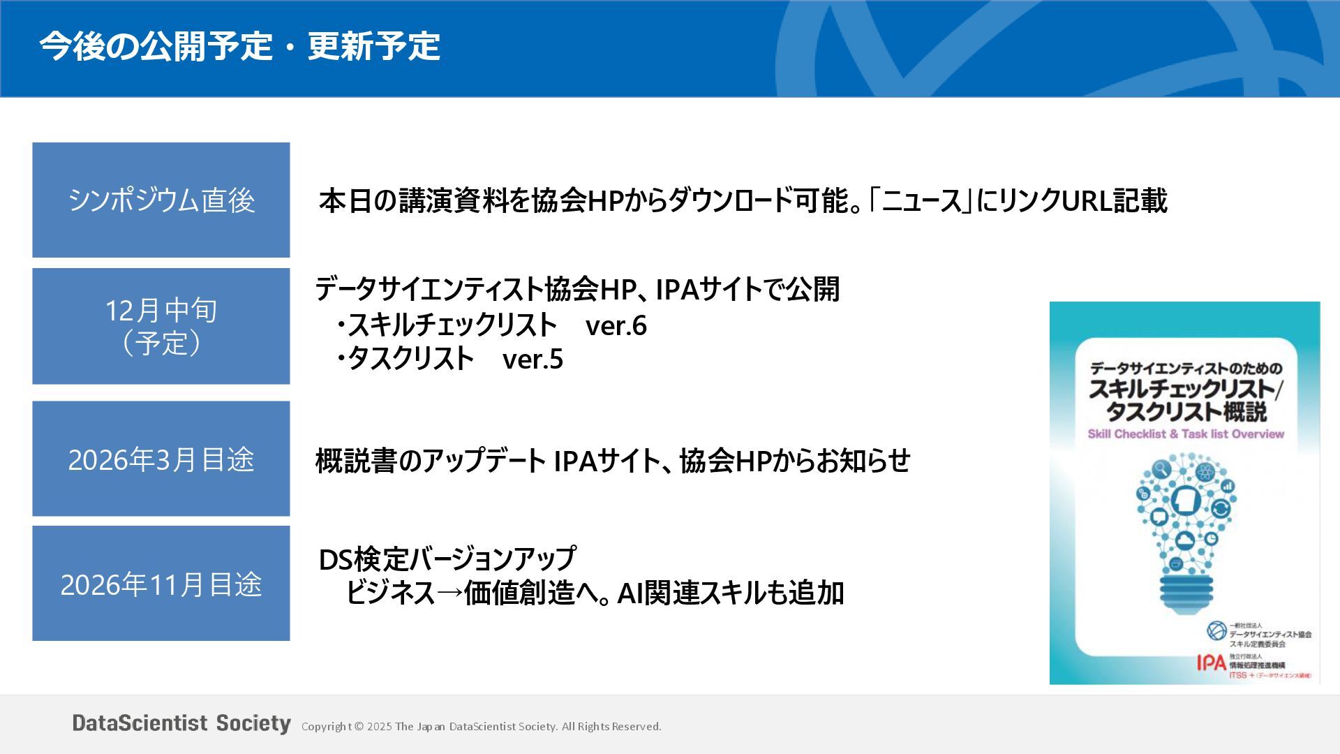 今後の公開予定・更新予定 シンポジウム直後 本日の講演資料を協会HPからダウンロード可能。「ニュース」にリンクURL記載 12月中旬 (予定) ・スキルチェックリスト ver.6 ・タスクリスト ver.5 2026年3月目途 概説書のアップデート IPAサイト、協会HPからお知らせ データサイエンティスト協会HP、IPAサイトで公開 2026年11月目途 DS検定バージョンアップ ビジネス→価値創造へ。AI関連スキルも追加