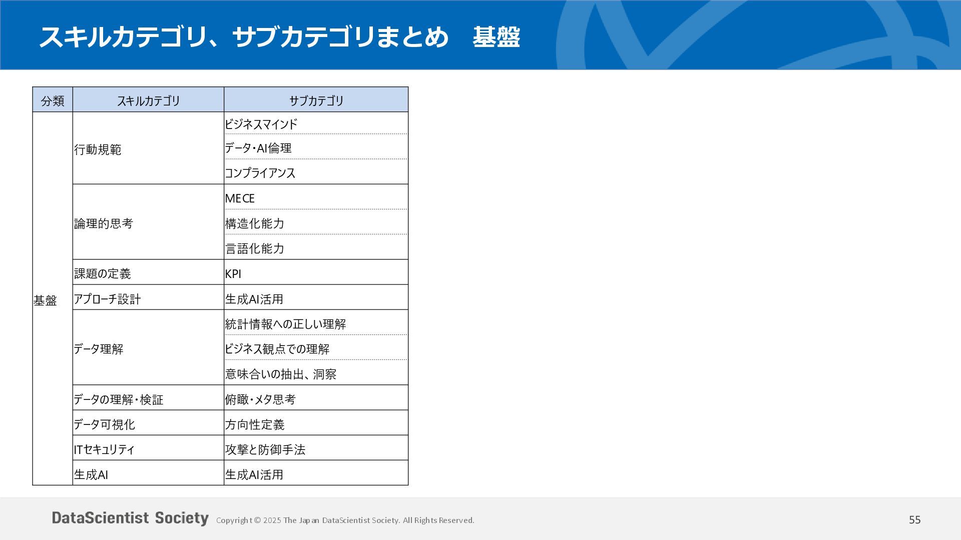 55 スキルカテゴリ、サブカテゴリまとめ 基盤 分類 スキルカテゴリ サブカテゴリ 基盤 行動規範 ビジネスマインド データ・AI倫理 コンプライアンス 論理的思考 MECE 構造化能力 言語化能力 課題の定義 KPI アプローチ設計 生成AI活用 データ理解 統計情報への正しい理解 ビジネス観点での理解 意味合いの抽出、洞察 データの理解・検証 俯瞰・メタ思考 データ可視化 方向性定義 ITセキュリティ 攻撃と防御手法 生成AI 生成AI活用