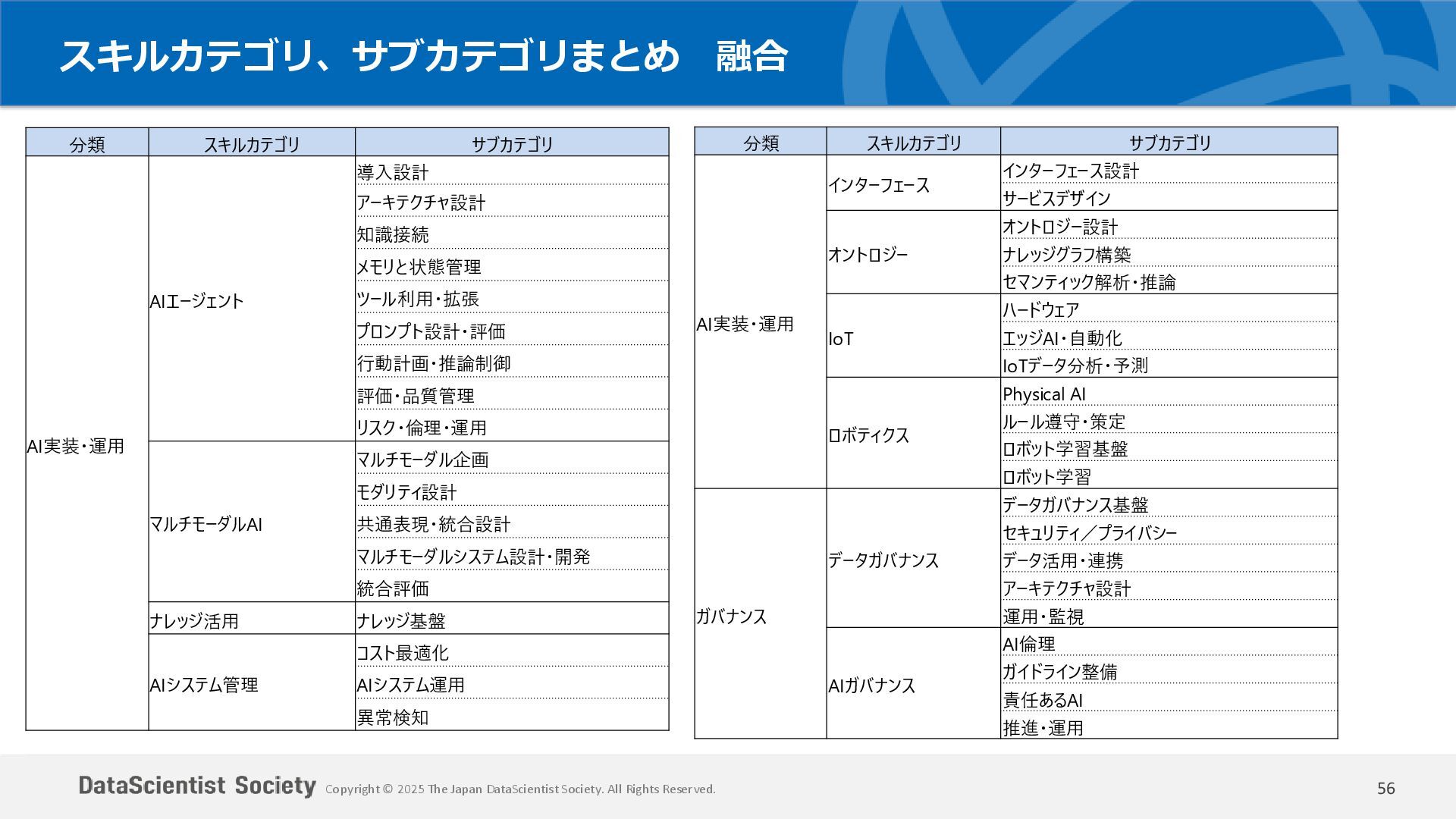 スキルカテゴリ、サブカテゴリまとめ 融合 56 分類 スキルカテゴリ サブカテゴリ AI実装・運用 AIエージェント 導入設計 アーキテクチャ設計 知識接続 メモリと状態管理 ツール利用・拡張 プロンプト設計・評価 行動計画・推論制御 評価・品質管理 リスク・倫理・運用 マルチモーダルAI マルチモーダル企画 モダリティ設計 共通表現・統合設計 マルチモーダルシステム設計・開発 統合評価 ナレッジ活用 ナレッジ基盤 AIシステム管理 コスト最適化 AIシステム運用 異常検知 分類 スキルカテゴリ サブカテゴリ AI実装・運用 インターフェース インターフェース設計 サービスデザイン オントロジー オントロジー設計 ナレッジグラフ構築 セマンティック解析・推論 IoT ハードウェア エッジAI・自動化 IoTデータ分析・予測 ロボティクス Physical AI ルール遵守・策定 ロボット学習基盤 ロボット学習 ガバナンス データガバナンス データガバナンス基盤 セキュリティ/プライバシー データ活用・連携 アーキテクチャ設計 運用・監視 AIガバナンス AI倫理 ガイドライン整備 責任あるAI 推進・運用