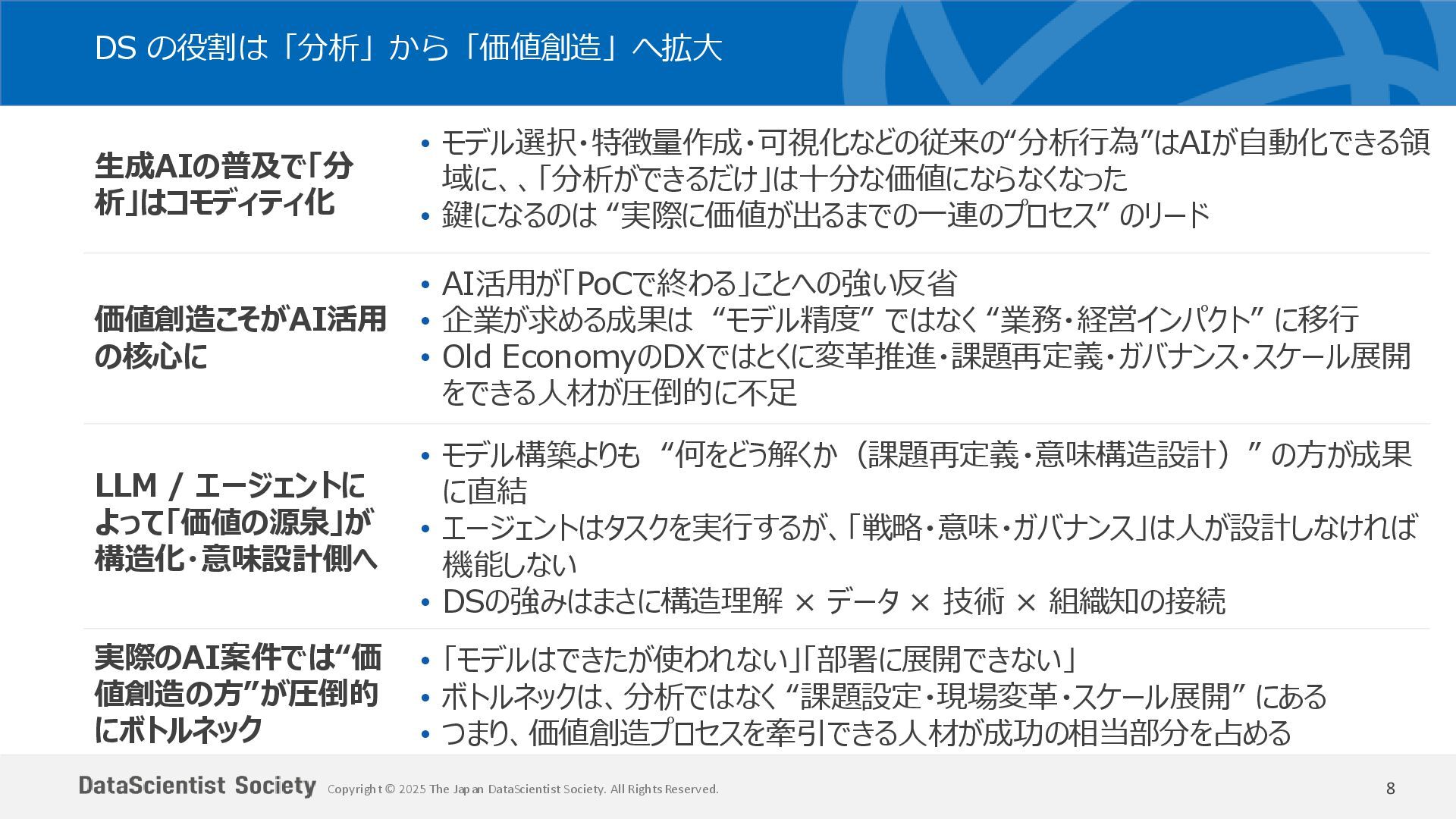DS の役割は「分析」から「価値創造」へ拡大 7 • 生成AIにより、従来の“分析”領域は大幅に自動化・コモディティ化 • 企業側の成功要因が「精度」から「価値創造・組織変革」へ完全にシフト • LLM/エージェントでは、課題再定義・意味設計・ガバナンス が成果の中心に • 実務では“分析”よりも 価値創造フェーズ(再定義→設計→展開) が最大 のボトルネック → これらにより、DSは価値創造の中心的役割を担う専門職 へと進化