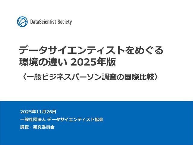 データサイエンティスト協会 調査・研究委員会(委員長:塩谷 周久)は、データサイエンス人材の需給バランス改善を目的に、認知・意識・活用実態を毎年調査しています。2025年は中国を加えた5カ国を対象に、データサイエンティストの社会的認知と生成AIの実務利用を国際比較しました。