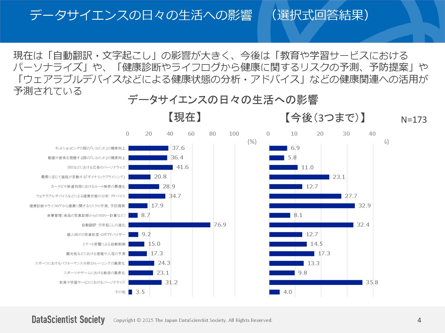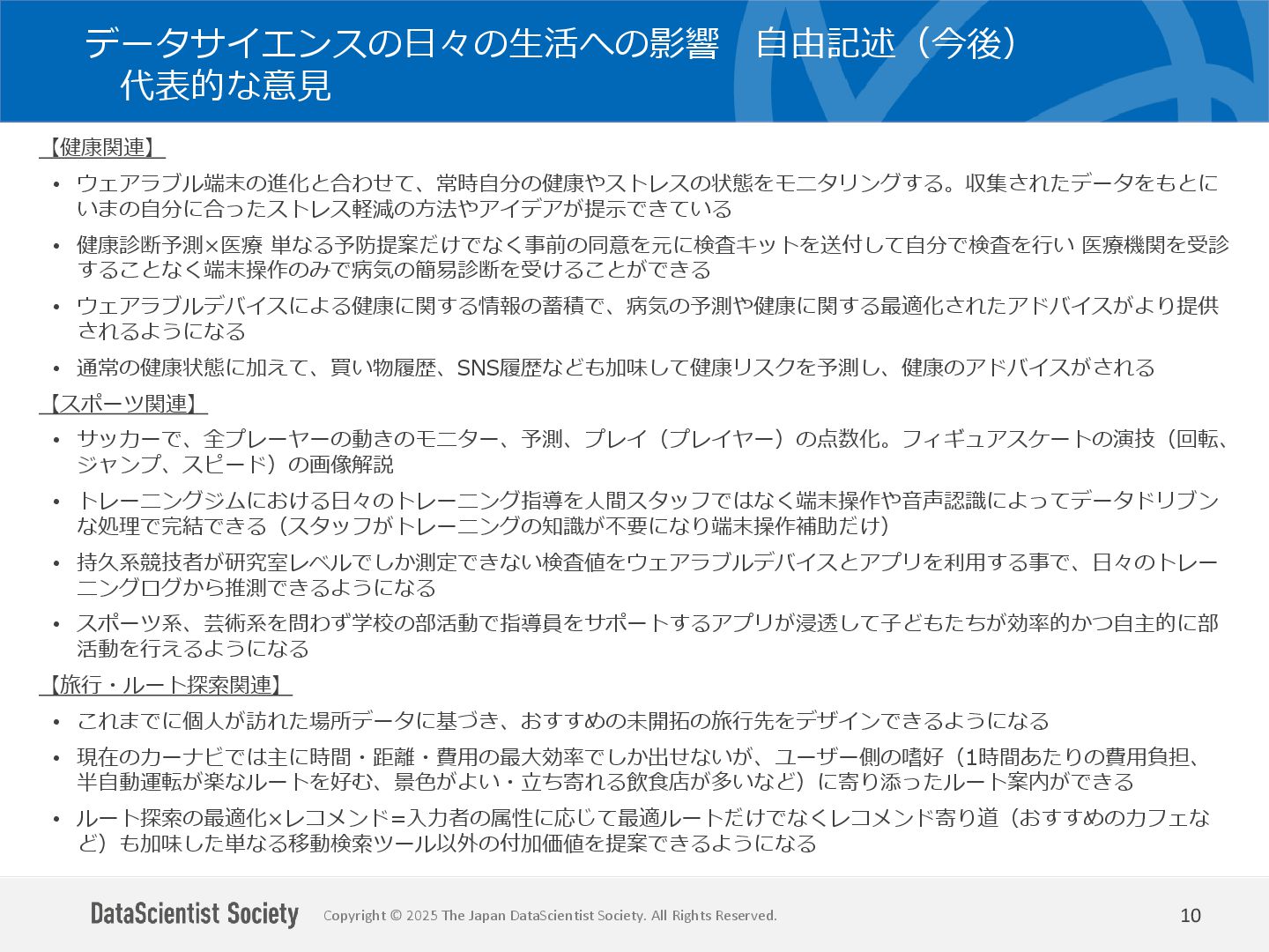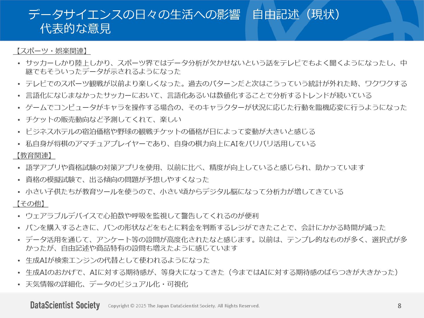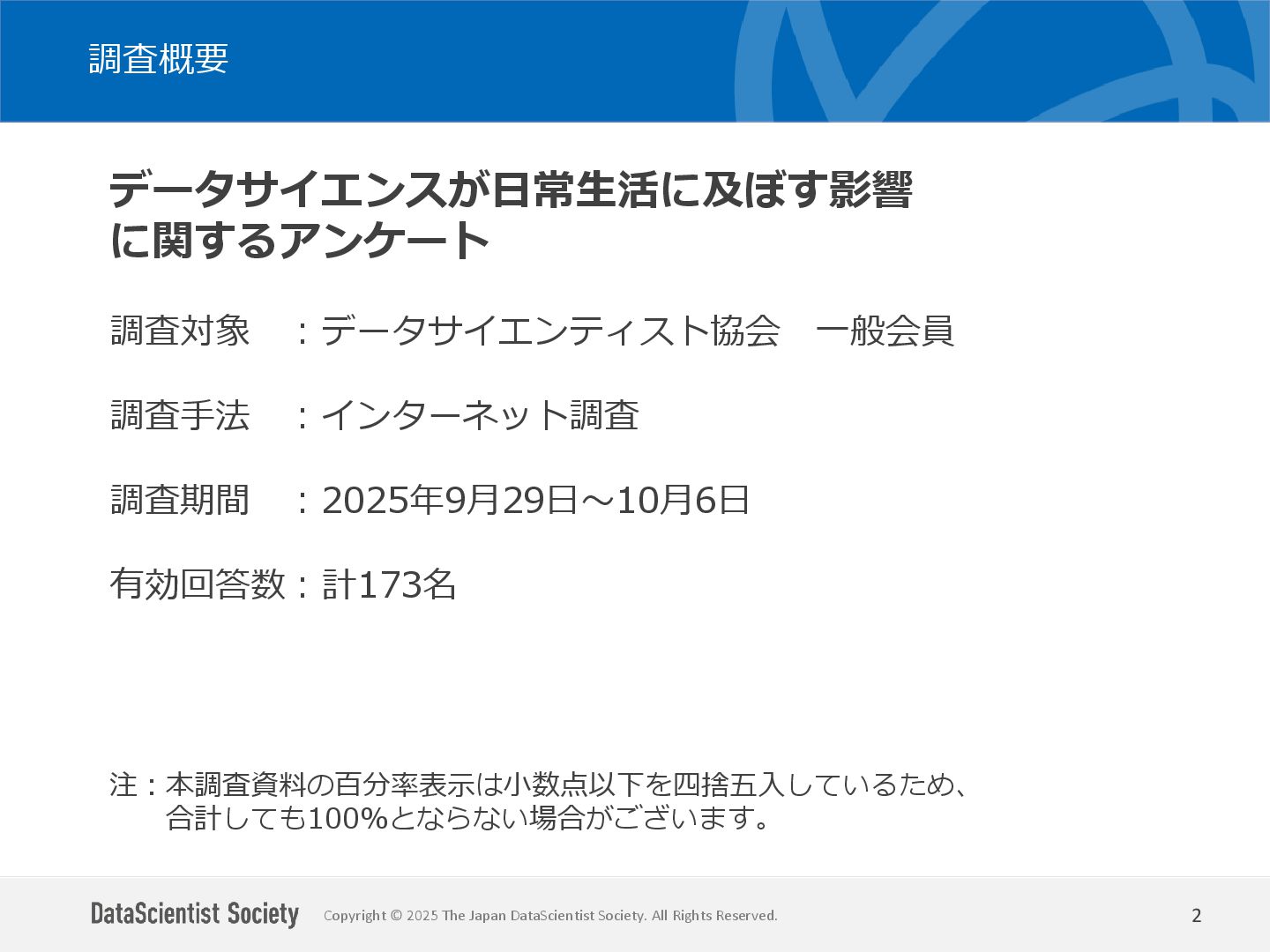 データサイエンティスト協会の調査・研究委員会では、一般(個人)会員を対象に「データサイエンスで変わる日常生活」というアンケート調査を実施しました。インターネットを活用した調査で、データサイエンスにより日常生活がどのように変化してきたか、あるいは、今後変化するかなどを自由回答形式中心に調査をしました。回答者数は173名でした。