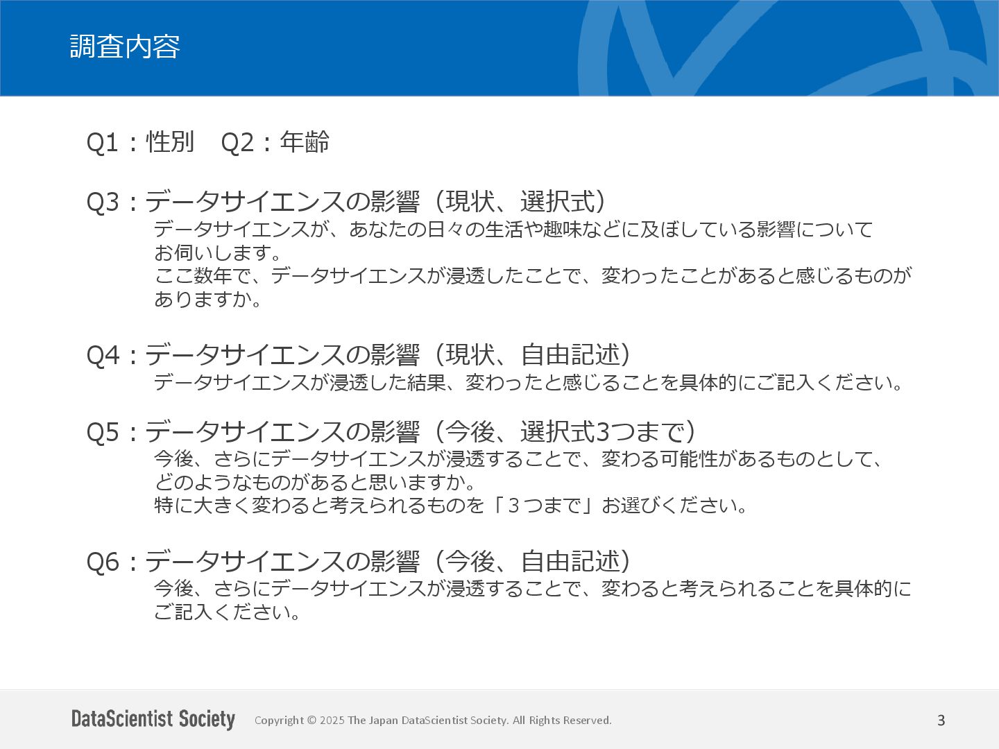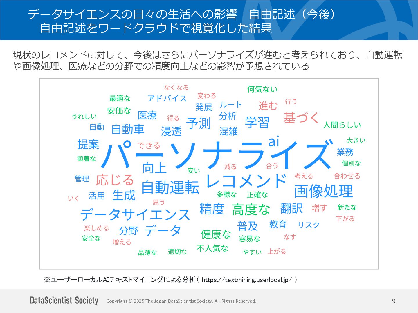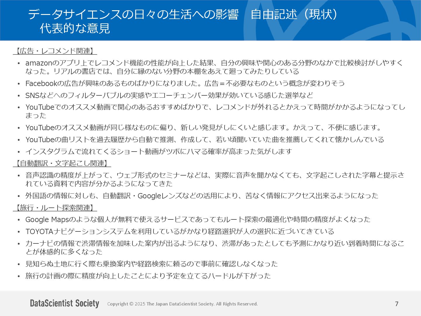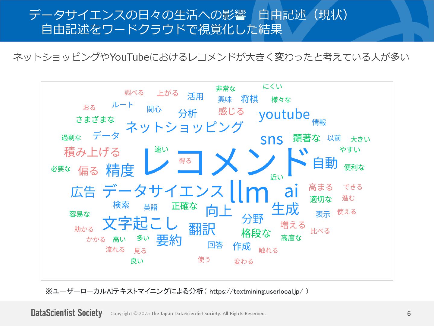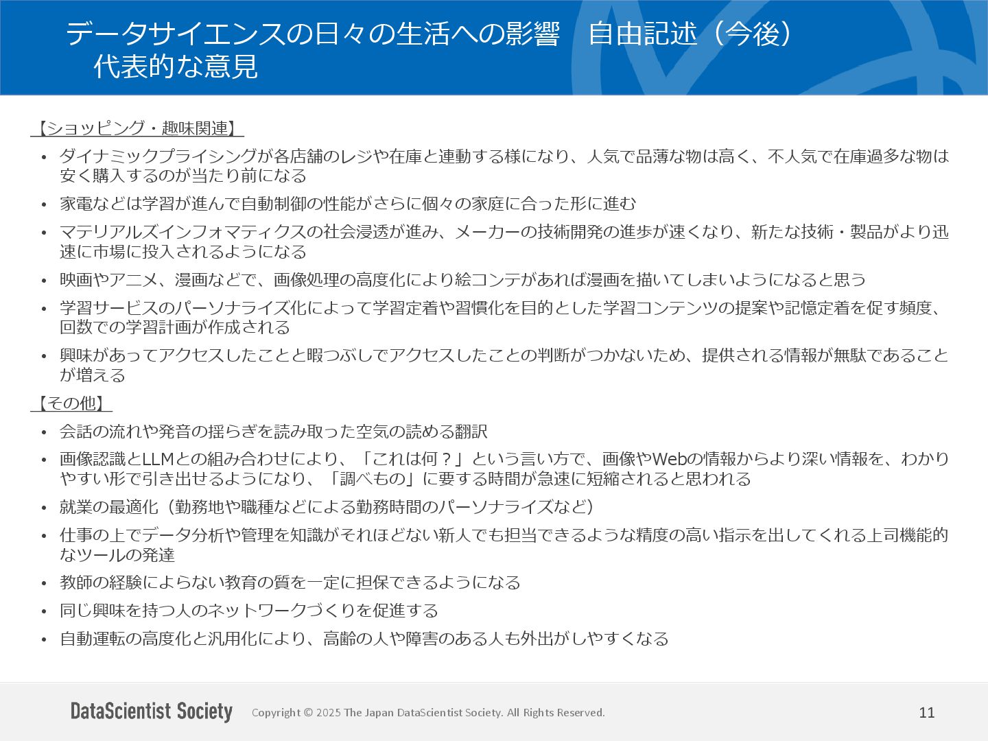 データサイエンティスト協会の調査・研究委員会では、一般(個人)会員を対象に「データサイエンスで変わる日常生活」というアンケート調査を実施しました。インターネットを活用した調査で、データサイエンスにより日常生活がどのように変化してきたか、あるいは、今後変化するかなどを自由回答形式中心に調査をしました。回答者数は173名でした。