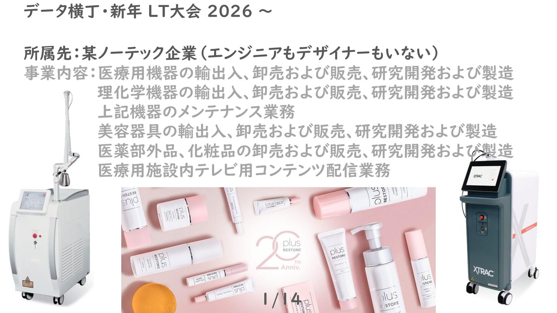 所属先:某ノーテック企業(エンジニアもデザイナーもいない) 事業内容:医療用機器の輸出入、卸売および販売、研究開発および製造 理化学機器の輸出入、卸売および販売、研究開発および製造 上記機器のメンテナンス業務 美容器具の輸出入、卸売および販売、研究開発および製造 医薬部外品、化粧品の卸売および販売、研究開発および製造 医療用施設内テレビ用コンテンツ配信業務 1/14 データ横丁・新年 LT大会