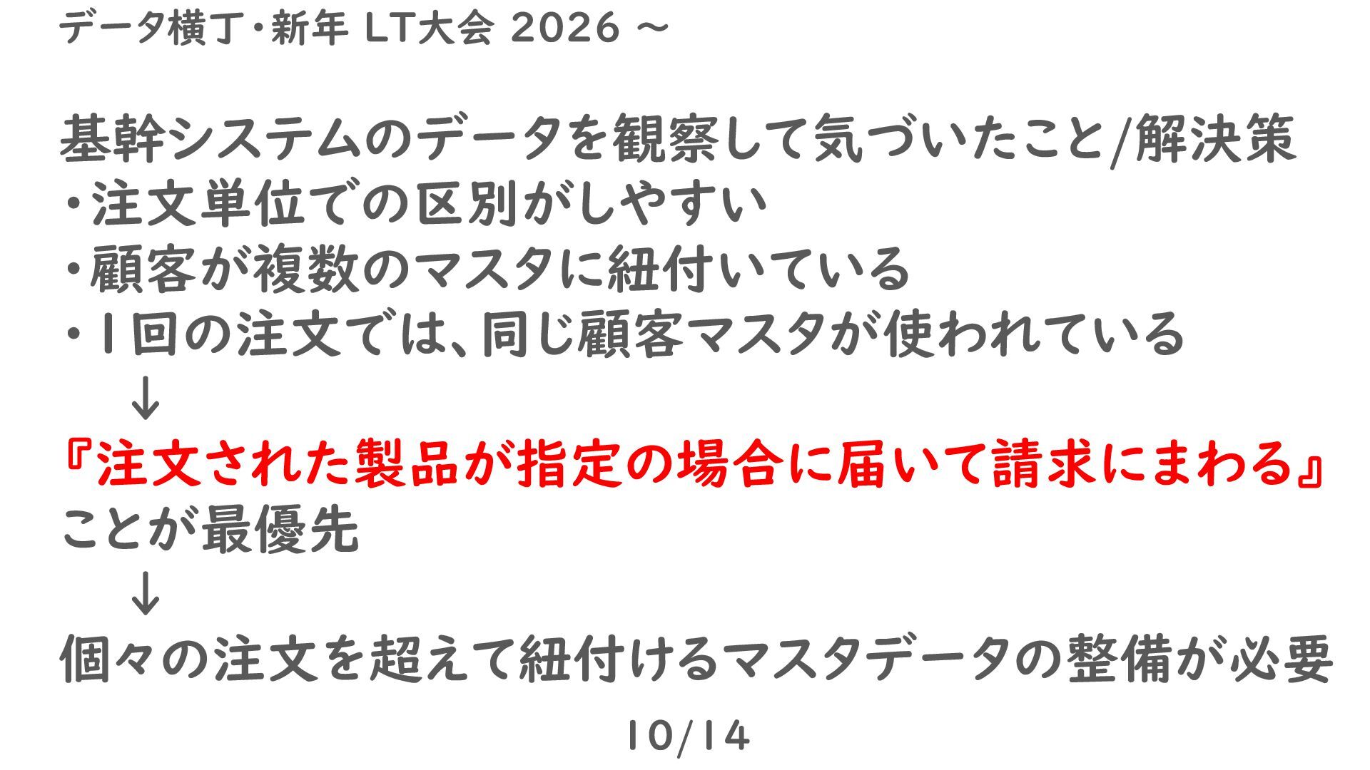 基幹システムのデータを観察して気づいたこと/解決策 ・注文単位での区別がしやすい ・顧客が複数のマスタに紐付いている ・1回の注文では、同じ顧客マスタが使われている ↓ 『注文された製品が指定の場合に届いて請求にまわる』 ことが最優先 ↓ 個々の注文を超えて紐付けるマスタデータの整備が必要 10/14