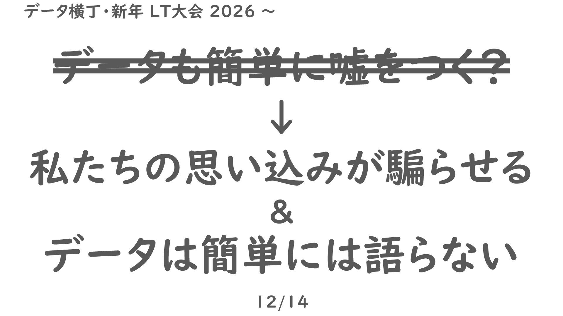 データも簡単に嘘をつく? ↓ 私たちの思い込みが騙らせる & データは簡単には語らない 12/14 データ横丁・新年 LT大会 2026 ~