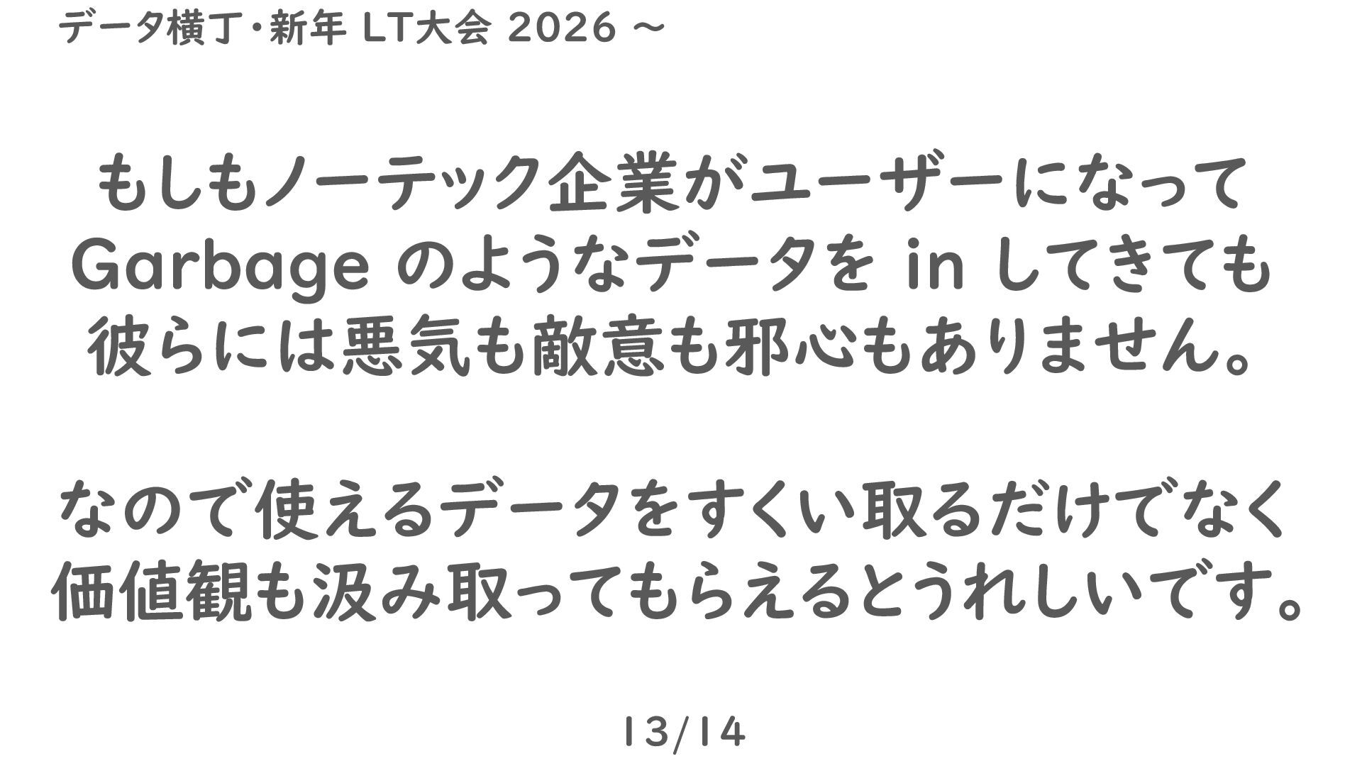 もしもノーテック企業がユーザーになって Garbage のようなデータを in してきても 彼らには悪気も敵意も邪心もありません。 なので使えるデータをすくい取るだけでなく 価値観も汲み取ってもらえるとうれしいです。 13/14 データ横丁・新年