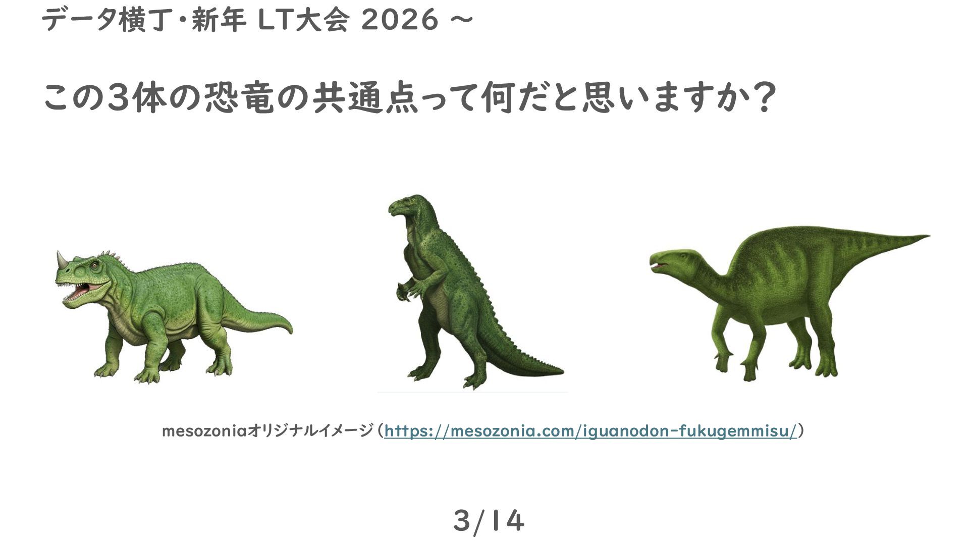 この3体の恐竜の共通点って何だと思いますか? 3/14 データ横丁・新年 LT大会 2026 ~ mesozoniaオリジナルイメージ(https://mesozonia.com/iguanodon-fukugemmisu/)