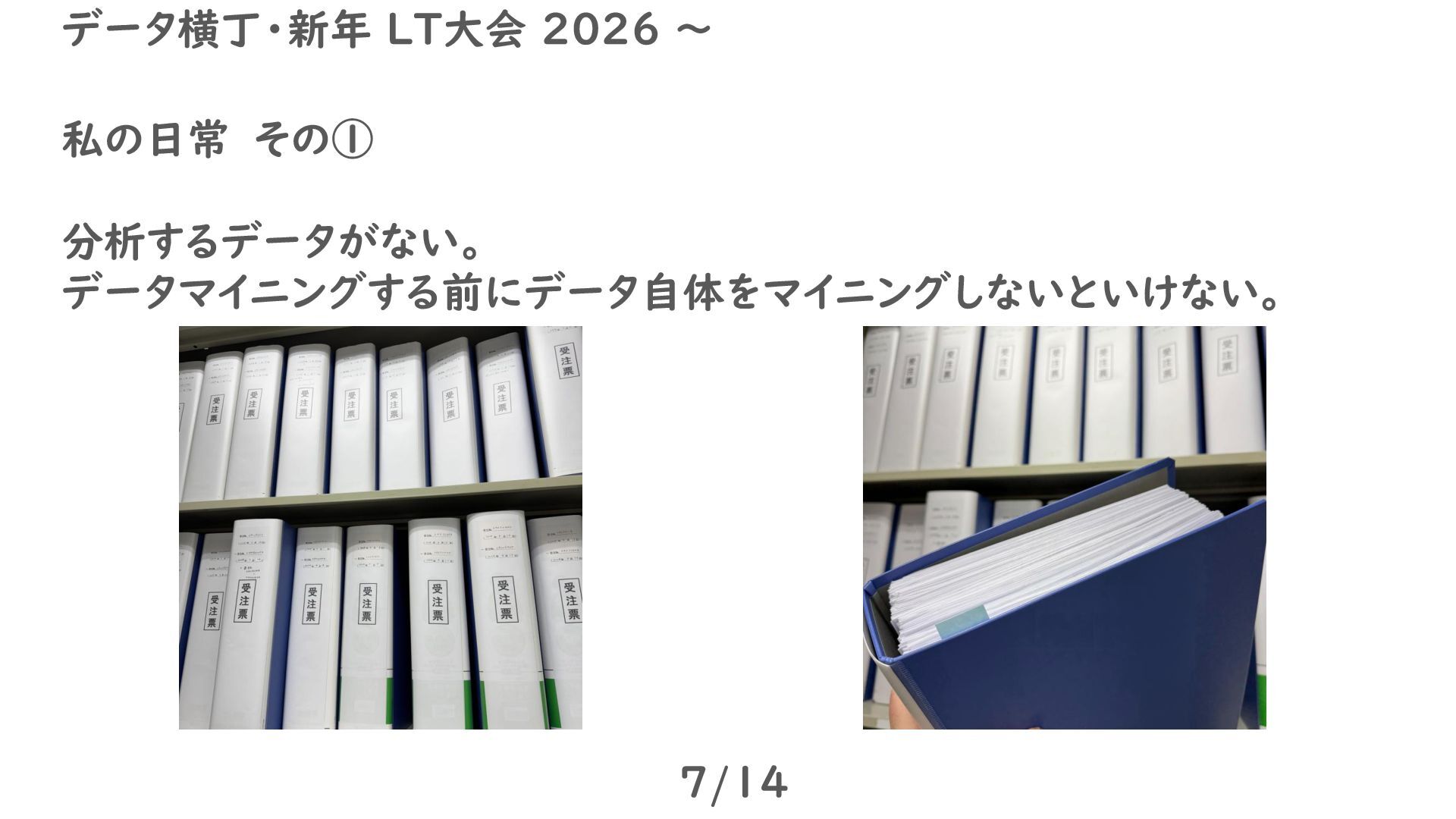 私の日常 その① 分析するデータがない。 データマイニングする前にデータ自体をマイニングしないといけない。 7/14 データ横丁・新年 LT大会 2026 ~
