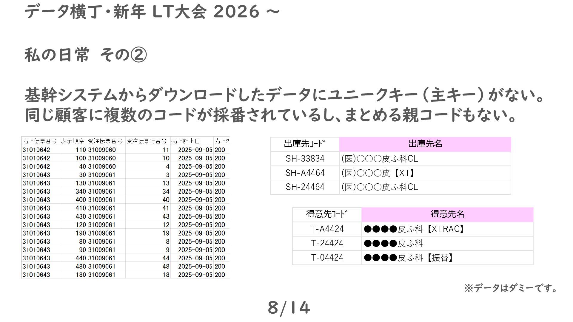 私の日常 その② 基幹システムからダウンロードしたデータにユニークキー(主キー)がない。 同じ顧客に複数のコードが採番されているし、まとめる親コードもない。 8/14 データ横丁・新年 LT大会 2026 ~ 出庫先コード