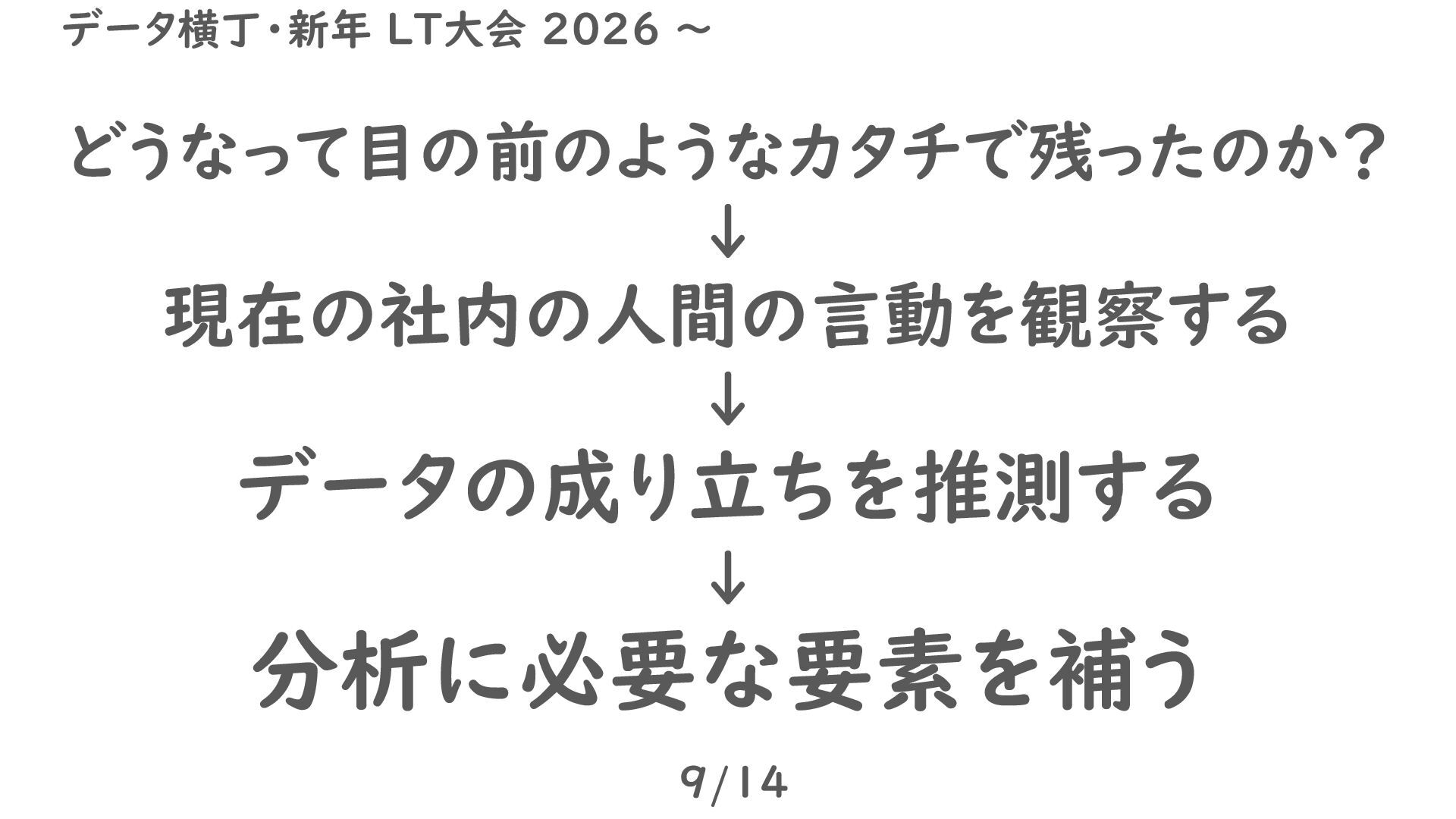 どうなって目の前のようなカタチで残ったのか? ↓ 現在の社内の人間の言動を観察する ↓ データの成り立ちを推測する ↓ 分析に必要な要素を補う 9/14 データ横丁・新年 LT大会