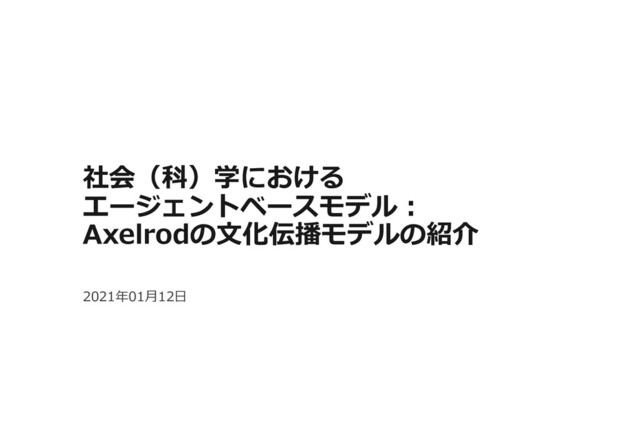 (特徴量(feature)) の数)で両者が交流 ※似たもの同⼠は交流しやすいこと(ホモフィリー)をモデル化している p 交流では、両者が持つ特徴量のうち特性が異なる特徴量がランダムに選択され、 近隣エージェントのそれが選択されたエージェントのそれに置き換わる ※交流するとより似てくる Axerlodの⽂化伝播モデル [5, 6, 0, 2, 8] [5, 6, 0, 2, 8] [5, 6, 0, 2, 8] [5, 6, 0, 2, 8] [5, 6, 0, 2, 8] [0, 1, 3, 0, 9] [4, 2, 1, 3, 1] [5, 6, 0, 2, 8] [9, 9, 3, 1, 1] [2, 3, 1, 4, 5] 交流する可能性が消失 交流しても特性の変化がない [0, 1, 3, 0, 9] [4, 2, 1, 2, 8] [5, 6, 0, 2, 8] [9, 9, 0, 1, 1] [2, 3, 1, 4, 5] 2/5 の確率で交流 [0, 1, 3, 0, 9] [4, 2, 1, 2, 8] [5, 2, 0, 2, 8] [9, 9, 0, 1, 1] [2, 3, 1, 4, 5]