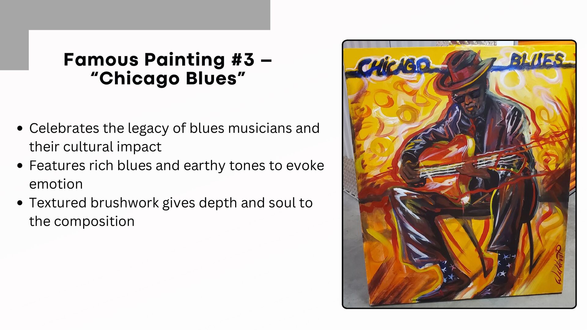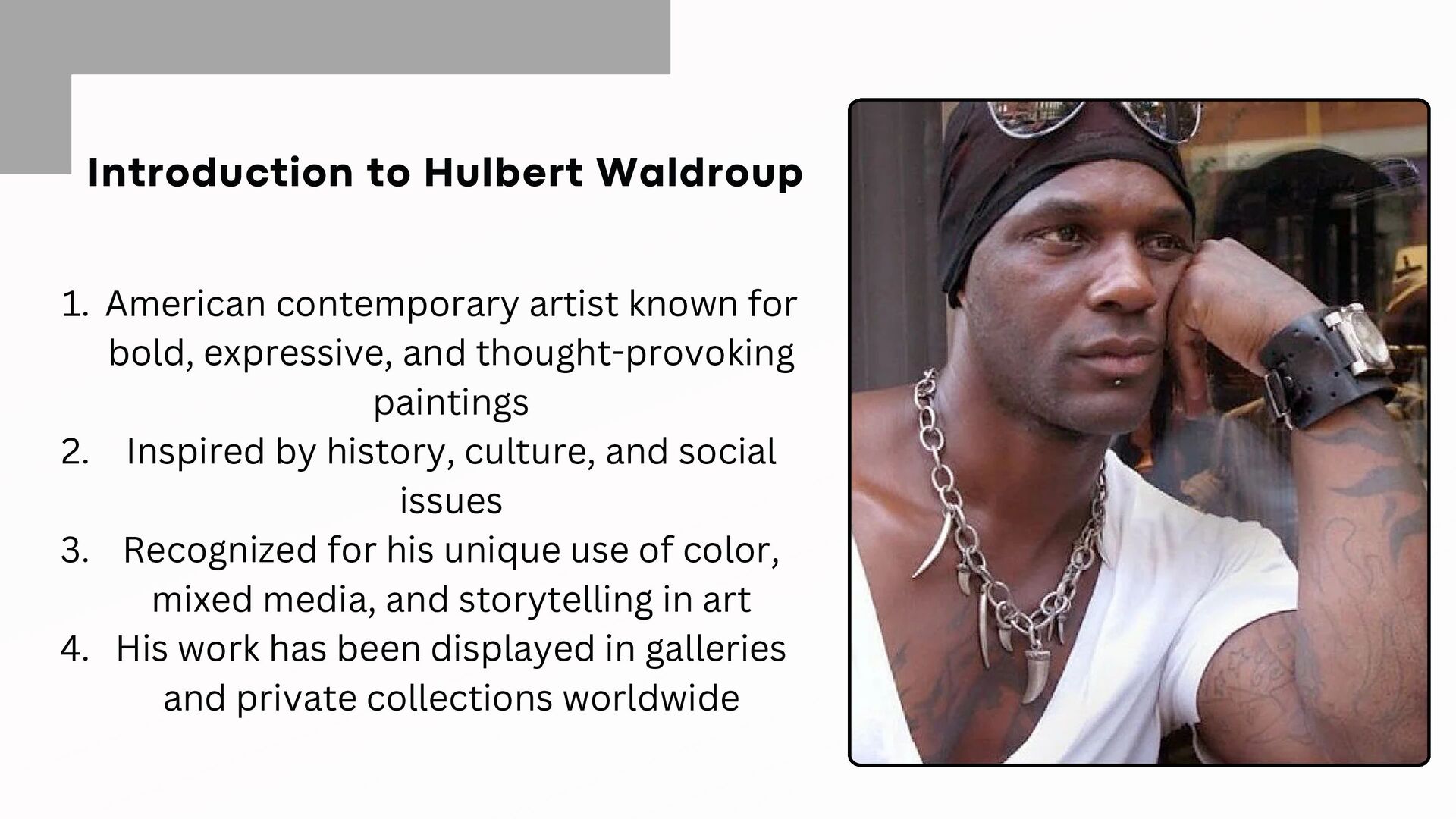 expressive, and thought-provoking paintings 1. Inspired by history, culture, and social issues 2. Recognized for his unique use of color, mixed media, and storytelling in art 3. His work has been displayed in galleries and private collections worldwide 4.