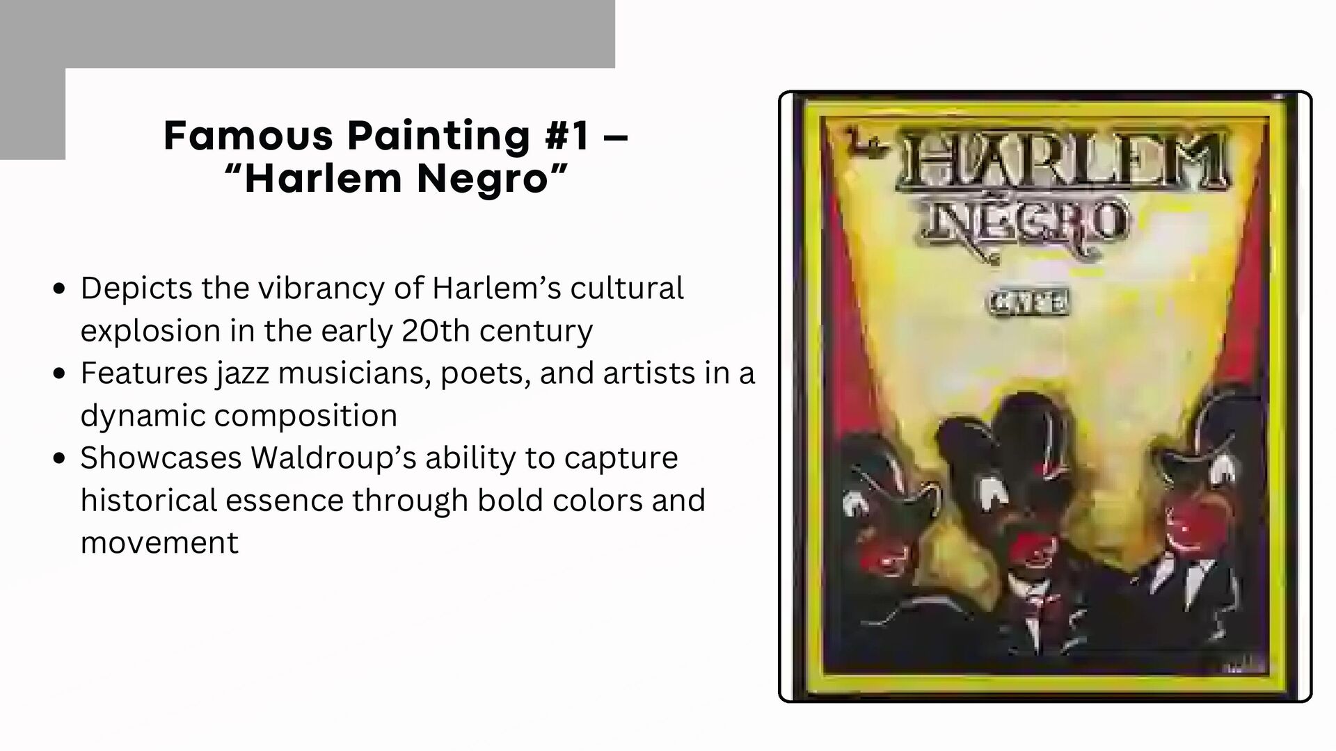 Harlem’s cultural explosion in the early 20th century Features jazz musicians, poets, and artists in a dynamic composition Showcases Waldroup’s ability to capture historical essence through bold colors and movement